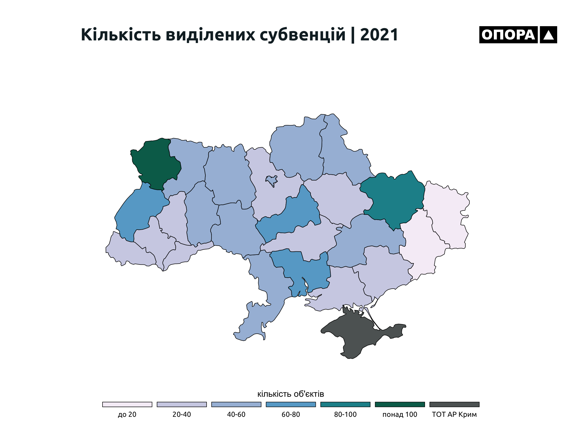 Щоправда, лідерами за середньою сумою субвенції на один об’єкт є дитячі та спортивні майданчики (10 мільйонів на 2 об’єкти, тобто середня сума субвенції становить 5 мільйонів), ЖКГ та інфраструктура (11 мільйонів на 3 об’єкти, середня сума 3,6 мільйони).