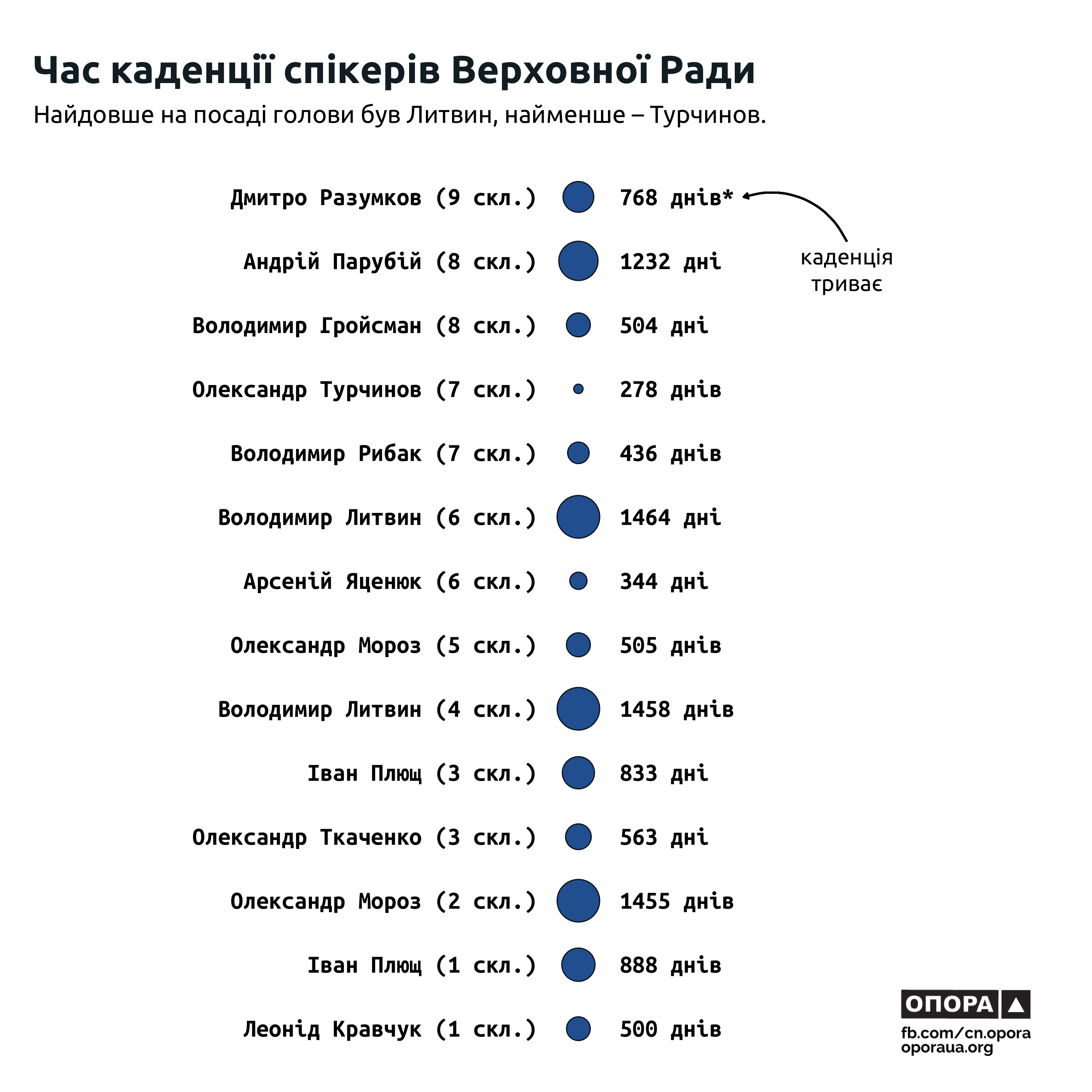 Найдовше на посаді спікера парламенту був Володимир Литвин (VI скликання) – трохи більше 4 років (1464 дні), а найменше – Олександр Турчинов – трохи більше 9 місяців (278 днів). Нинішній голова парламенту Дмитро Разумков – лише на сьомому місці за тривалістю каденції (понад 25 місяців).