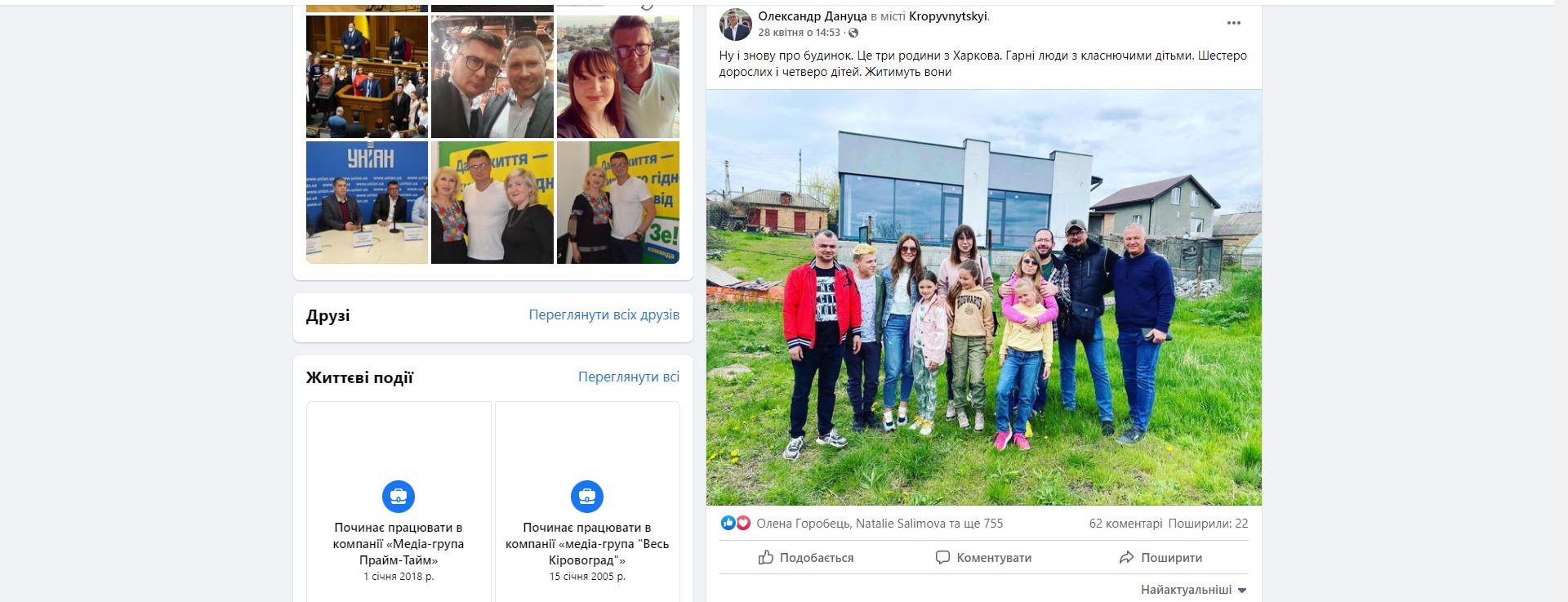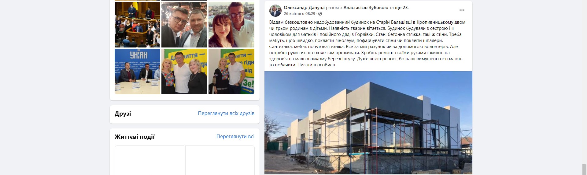 У квітні Олександр Дануца анонсував у соцмережах, що готовий безкоштовно надати власний недобудований будинок для переселенців. Дім розташований у Кропивницькому на Старій Балашівці. Наразі в приміщенні немає внутрішніх робіт — політик зазначив, що готовий допомогти зробити ремонт. У соцмережах ця подія викликала бурхливе обговорення. Нардеп запропонував проживання кільком родинам, що зроблять ремонт. Згодом Олександр Дануца оприлюднив фото трьох сімей із Харкова, які проживатимуть у приміщення після завершення ремонтних робіт.