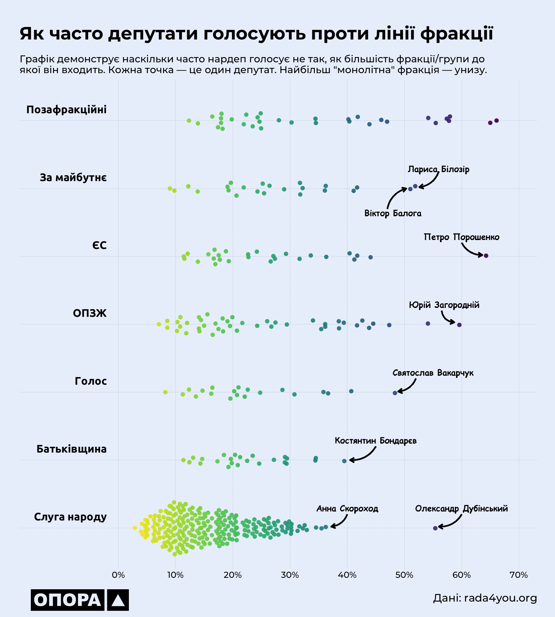 У депутатській групі “За майбутнє” найменш синхронно голосує Лариса Білозір. Вона у 52% випадків голосувала в розріз позиції групи. У Віктора Балоги відповідний показник становить 51%.