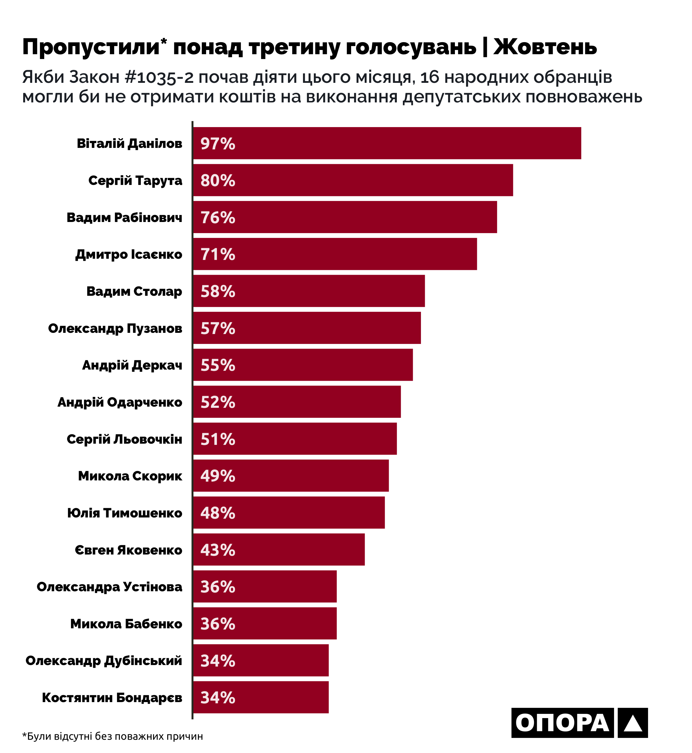 Так, найбільше голосувань у жовтні без поважних причин пропустив Віталій Данілов з ВО “Батьківщина”. Парламентар не відвідав 97% голосувань у парламенті. На другому місці за цим показником опинився ще один депутат з “Батьківщини” Сергій Тарута, що пропустив 80% голосувань. На третій позиції – Вадим Рабінович з “Опозиційної платформи – За життя”,  який не був присутній на 76% голосувань.
