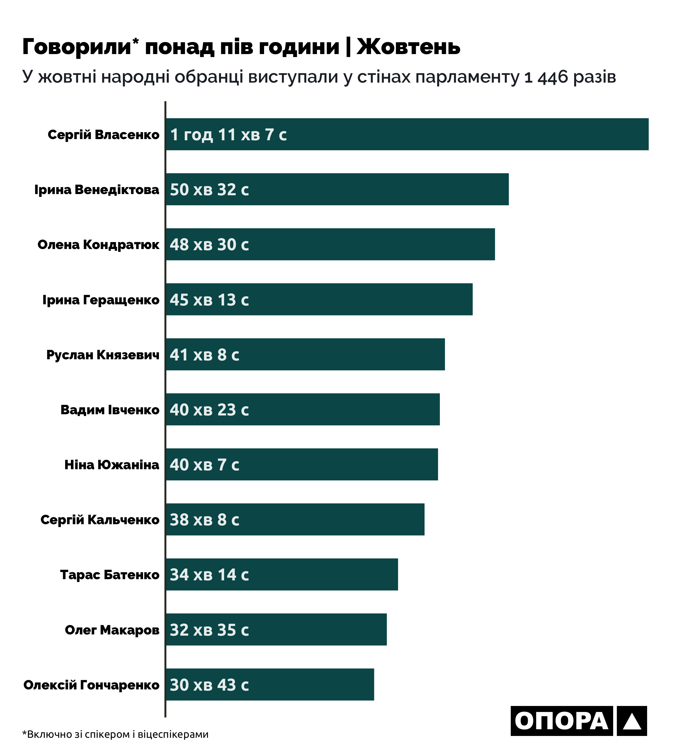 У жовтні народні обранці виступали у стінах парламенту 1 446 разів. Загальна тривалість всіх виступів – майже 27 з половиною годин.