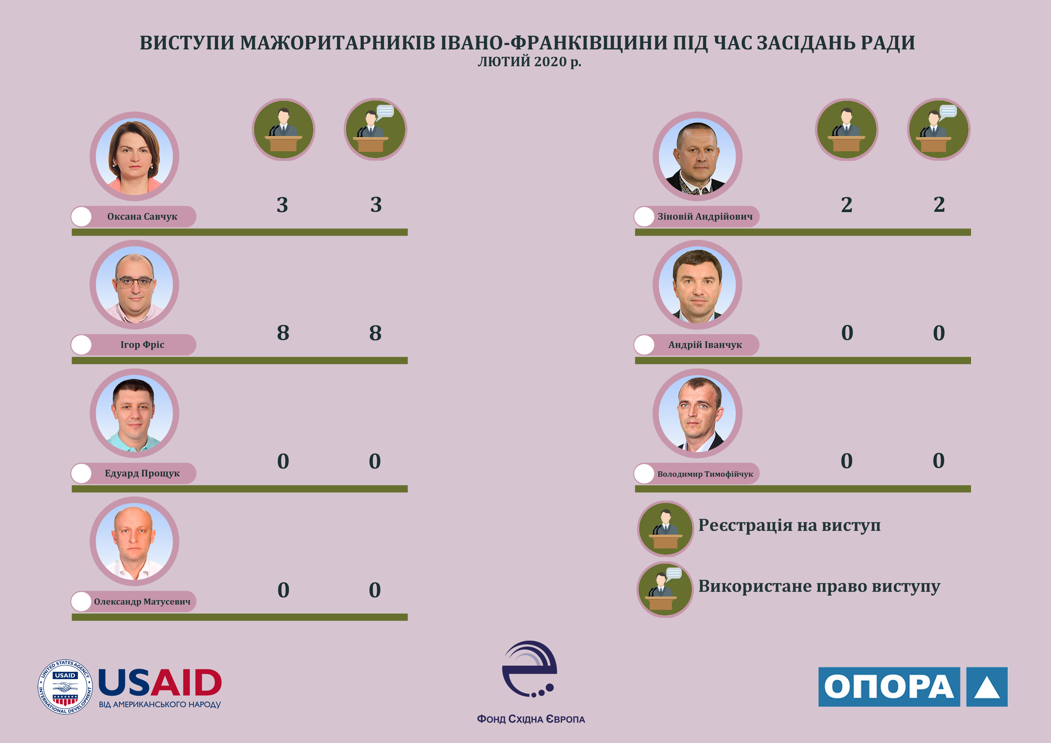 Загалом, протягом лютого прикарпатські мажоритарники 13 разів виступали під час пленарних засідань Верховної ради. Найактивніше цим правом користувався Ігор Фріс – 8 виступів. Четверо парламентарів цим правом не скористалися жодного разу.