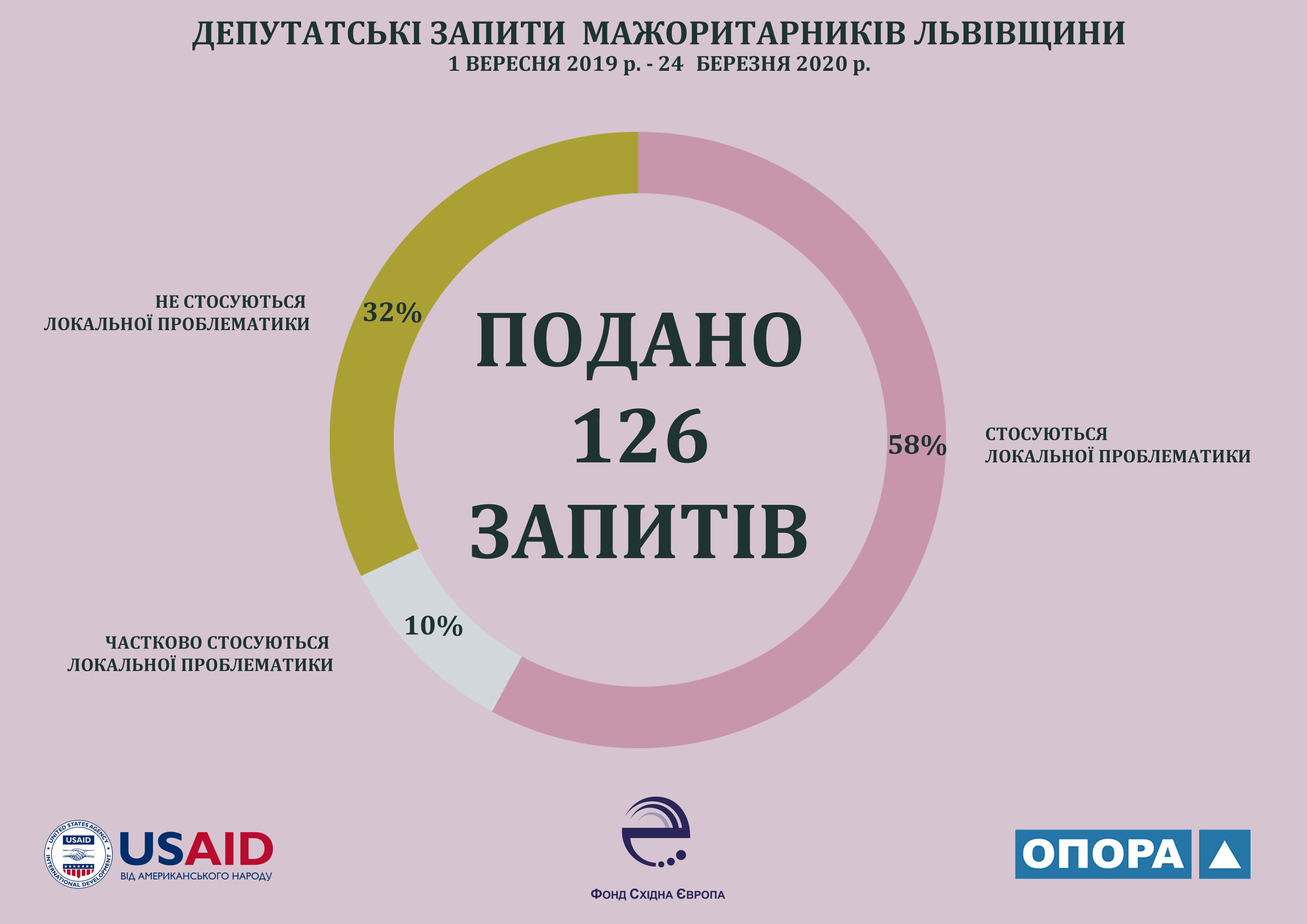 З вересня 2019 року по березень 2020 року народні депутати-мажоритарники Львівської області сумарно скерували 126 запитів, в яких вирішувалося 81 проблемне питання. З них 58% мали локальний характер, 10% частково стосувалися проблематики області, а 32% запитів не мали чіткої локальної прив’язки до Львівщини. Сім мажоритарників використовували депутатський запит для вирішення локальних проблем Львівщини (Тарас Батенко, Михайло Бондар, Павло Бакунець, Галина Васильченко, Ярослав Дубневич, Наталія Піпа та Андрій Лопушанський), двоє парламентарів порушували питання, яке частково стосується області (Юрій Камельчук та Орест Саламаха), двоє народних обранців у депутатських запитах концентрувалися на проблемах національного рівня (Микола Княжицький та Андрій Кіт), а один парламентар не використовує депутатський запит у власній діяльності (Ярослав Рущишин).