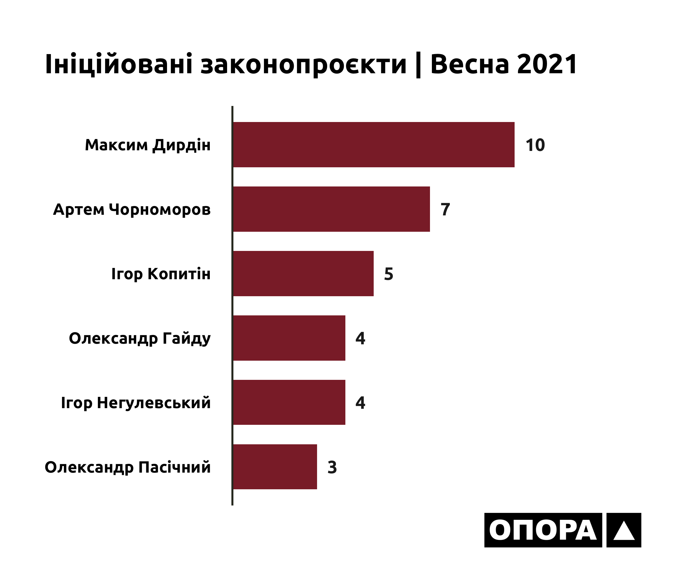 Протягом березня – травня 2021 року мажоритарники Миколаївщини сукупно зареєстрували 33 законопроєкти. Найбільше законопроєктів зареєстрував народний депутат по 132 мажоритарному округу Максим Дирдін – 10 законодавчих ініціатив. Народний депутат є членом Комітету Верховної Ради України з питань правової політики. Тому чотири зареєстрованих законопроєкти депутата стосувались сфери правової політики, в якій депутат виступає експертом: №5231-1 про внесення змін до Закону України «Про судоустрій і статус суддів» та інших Законів щодо дистанційного проведення з’їзду суддів України з кадрових питань; №5456 про внесення змін до Закону України «Про судоустрій і статус суддів» (щодо приведення положень Закону у відповідність до Рішення Конституційного Суду України від 18.02.2020 року № 2-р/2020); 5249-1 про амністію з нагоди 30-ї річниці незалежності України; №5517 про внесення змін до Кодексу України про адміністративні правопорушення щодо посилення відповідальності за порушення законодавства у сфері охорони навколишнього природного середовища.