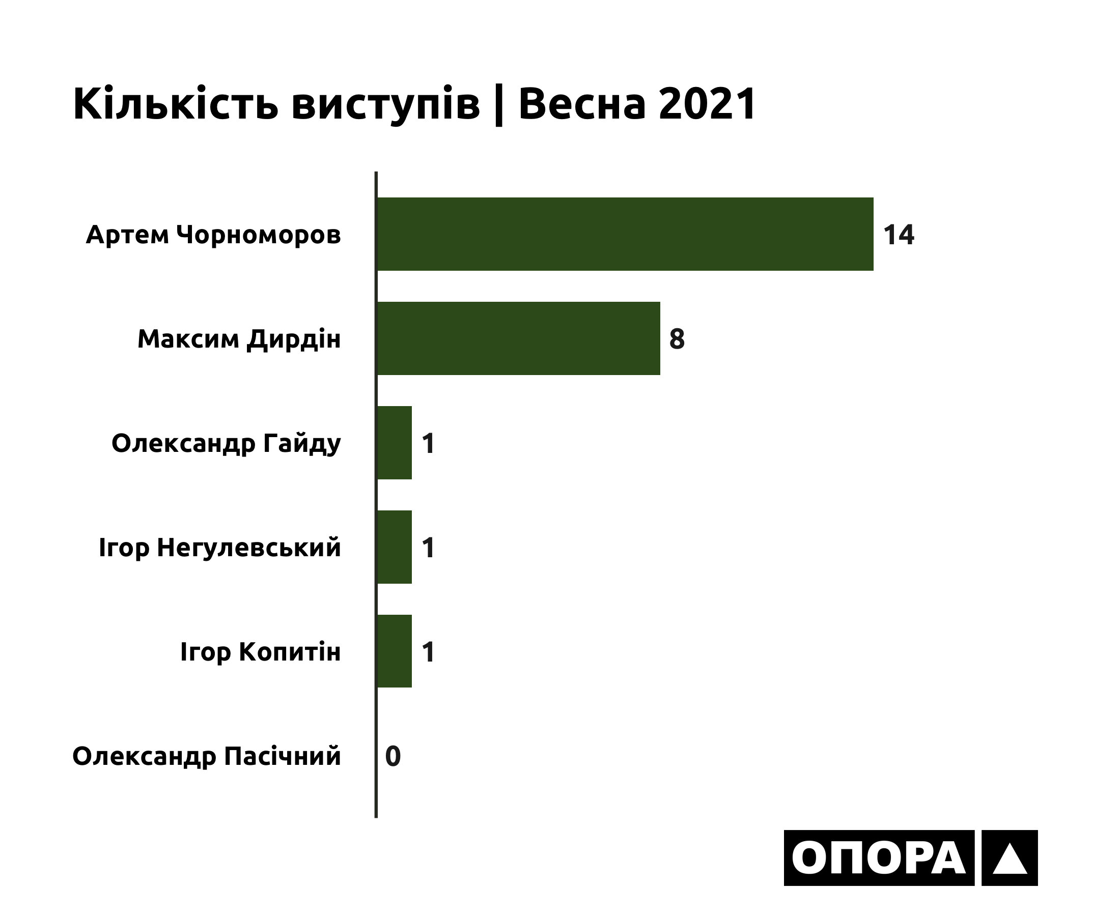 Ще одним важливим правом народного депутата є право на виступ на сесіях Верховної Ради. Виступ дає можливість народному депутату донести до колег важливі питання, проблематику або обґрунтувати свої пропозиції. Навесні 2021 року п’ять миколаївських мажоритарників брали слово загальною тривалістю у майже півгодини. Найбільшу кількість виступів має Артем Чорноморов – 14 виступів, загальною тривалістю 21 хвилина 15 секунд. Максим Дирдін виступав 8 разів протягом 5 хвилин 2 секунди. Та по одному виступу мають народні депутати Ігор Негулевський (1 хвилина 51 секунда), Ігор Копитін (7 секунд) та Олександр Гайду (6 секунд). До прикладу, на власній сторінці у Facebook Артем Чономоров зазнає, що виступив з трибуни Верховної Ради з приводу поганих доріг на 131 виборчому окрузі.