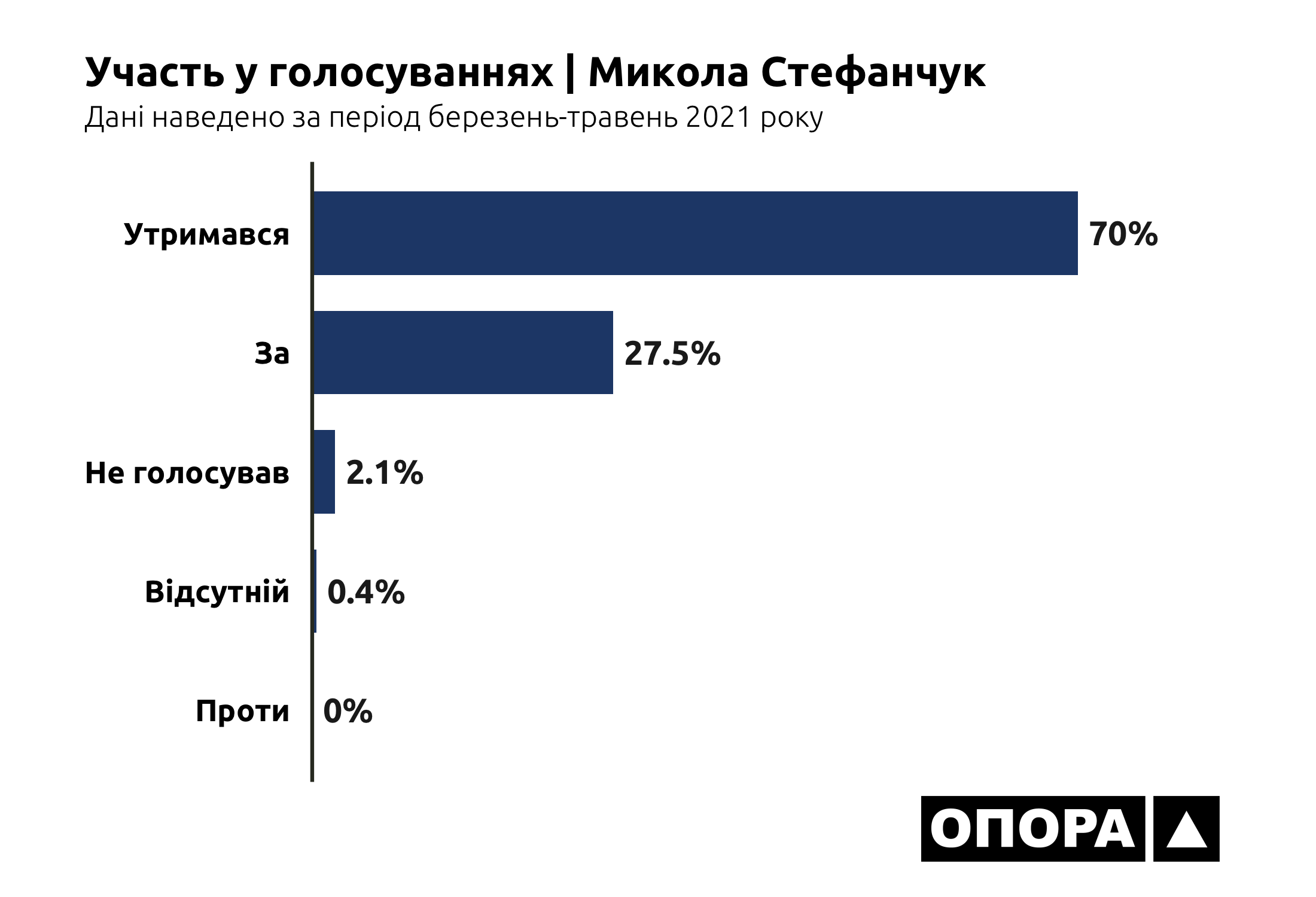 Показовим є відсоток голосувань нардепів-мажоритарників від Хмельниччини всупереч більшості в фракції, до якої належать. Аналіз усіх голосувань від початку каденції за допомогою сервісу ОПОРИ «Вони голосують для тебе» засвідчує, що представники фракції партії «Слуга народу» лише зрідка не підтримують загальну лінію фракції: у Олексія Жмеренецького 7,4% голосувань проти фракції, в Олени Копанчук – 7,3%, в Ігоря Марчука – 9,4%, а в Миколи Стефанчука – 4,4%.