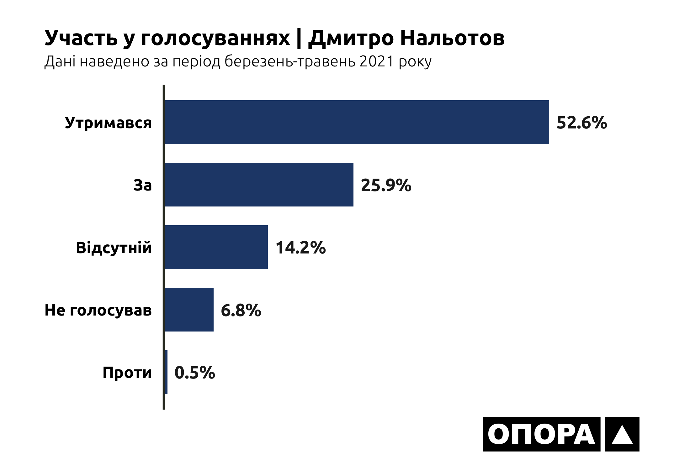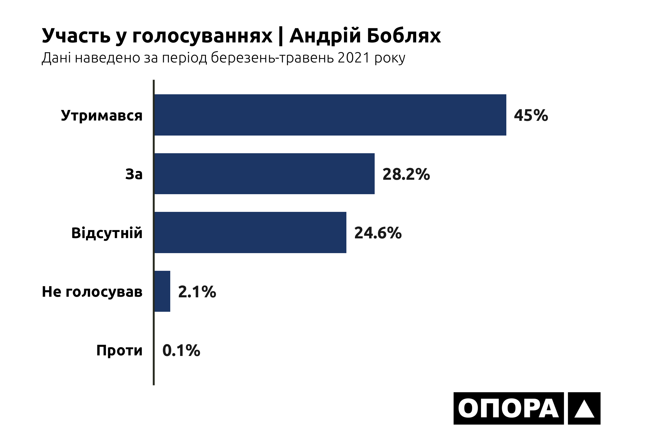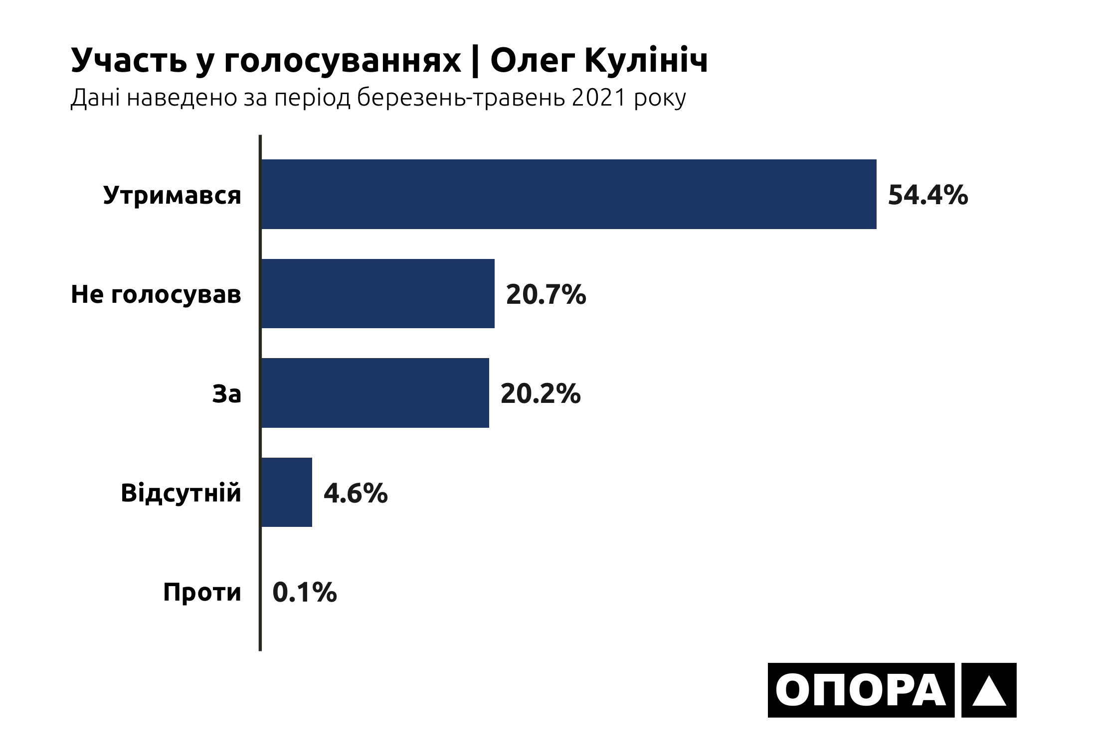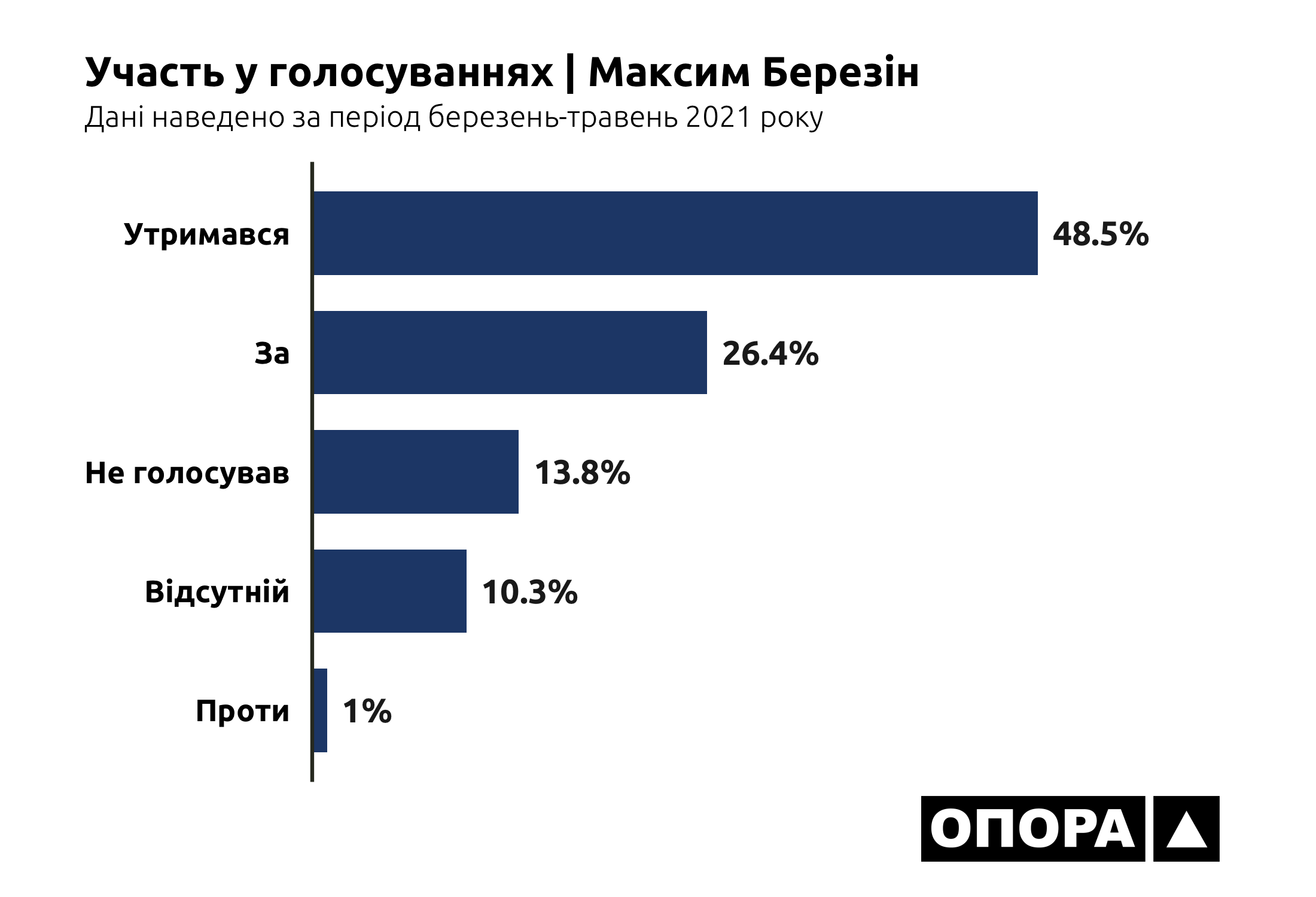 Голосування «проти» непопулярне серед депутатів. Найбільше – аж 18 разів із 1778 голосувань – проголосував депутат від «Слуги народу» Максим Березін. Народний обранець активно голосував «За» (26,4% голосувань), але й утримався майже в половині випадків (48,5%).