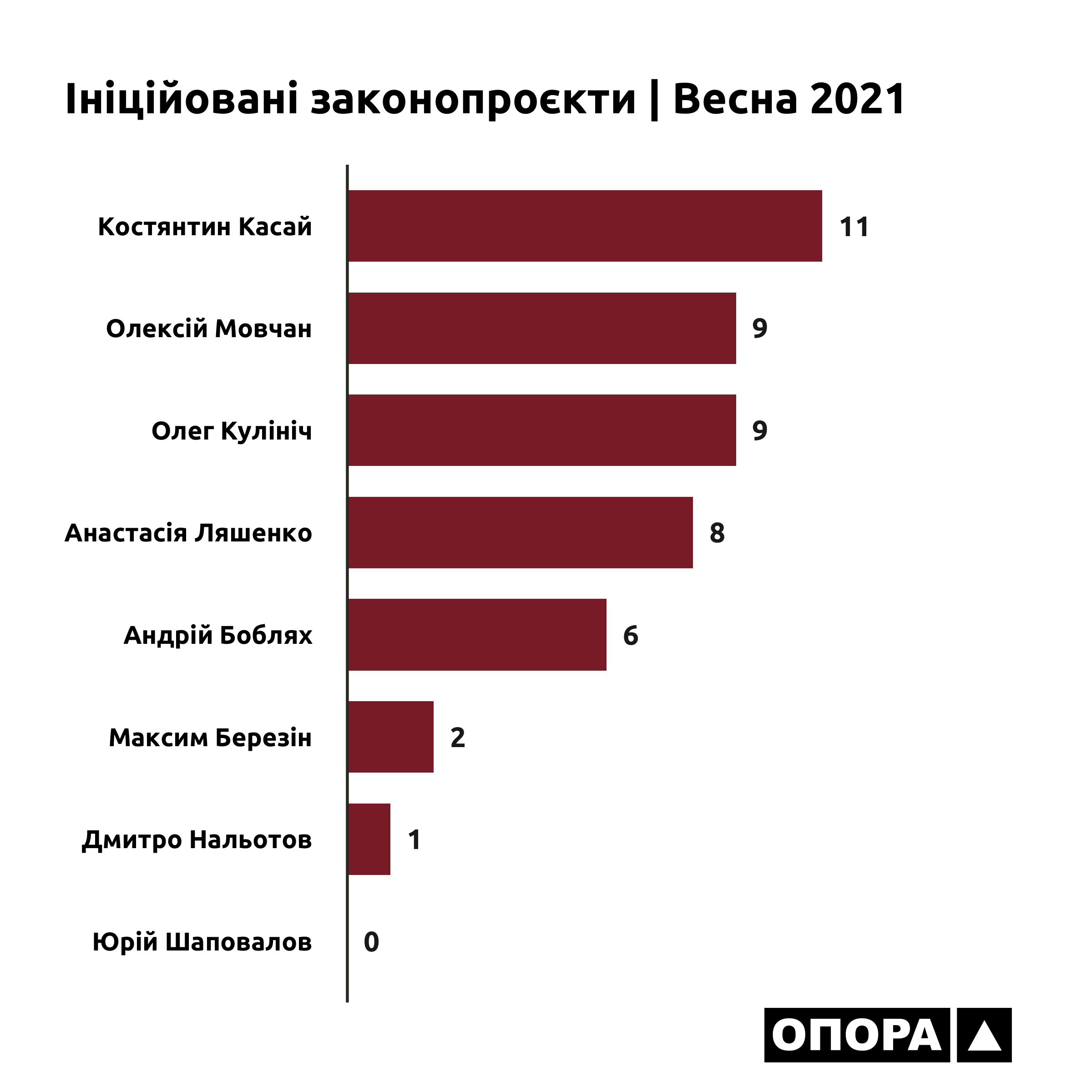 Загалом весною 2021 року ініційовано 46 законопроєктів депутатами від Полтавської області. Найактивнішими виявилися Костянтин Касай («Слуга народу»), Олег Кулініч (депутатська група «Довіра») та Олексій Мовчан («Слуга народу»). Не ініціював жодного законопроєкту весною 2021 року Юрій Шаповалов (депутатська група «Партія «За майбутнє»).