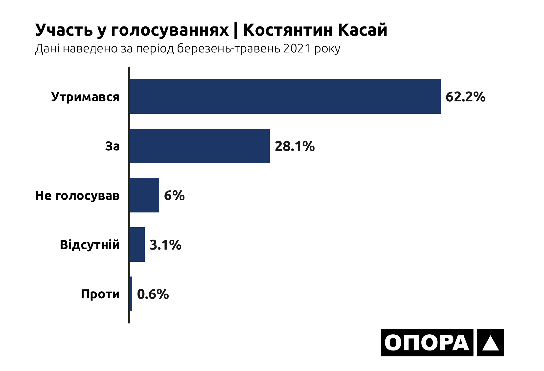 Найчастіше утримувався від голосування Костянтин Касай, партія «Слуга народу» (62,2%). Більш ніж у половині випадків утрималися також Олексій Мовчан («Слуга народу») – 57,1%, Олег Кулініч («Довіра») - 54,4%, Дмитро Нальотов («Слуга народу») – 52,6%