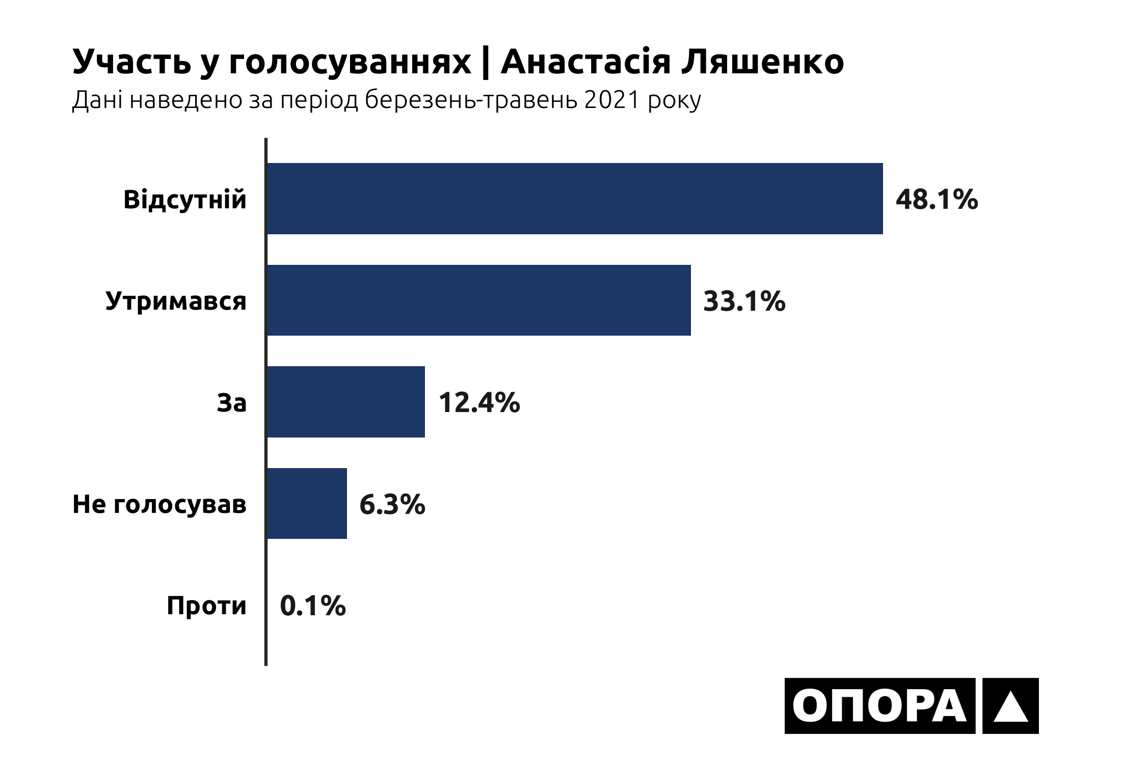 Анастасія Ляшенко лідирує в області за показником відсутності – навесні 2021 року вона пропустила майже половину голосувань (48,1%). У третині випадків депутатка утримувалася (33,1%), а відсоток голосувань «За» найменший серед обранців області – лише 12,4%.