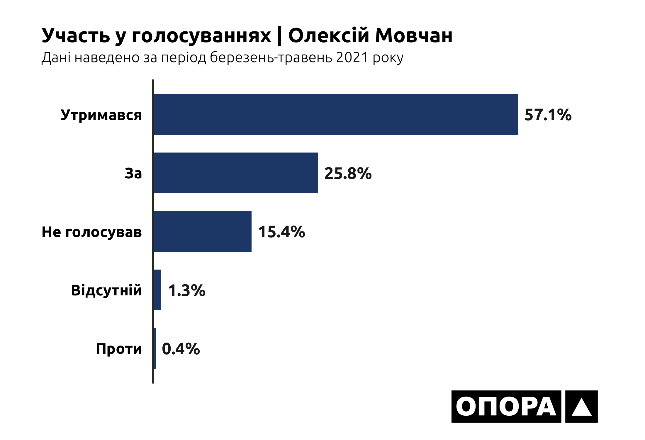 Олексій Мовчан («Слуга народу») – навпаки, майже не пропускав засідань (був відсутній лише 23 рази або 1,3% голосувань).