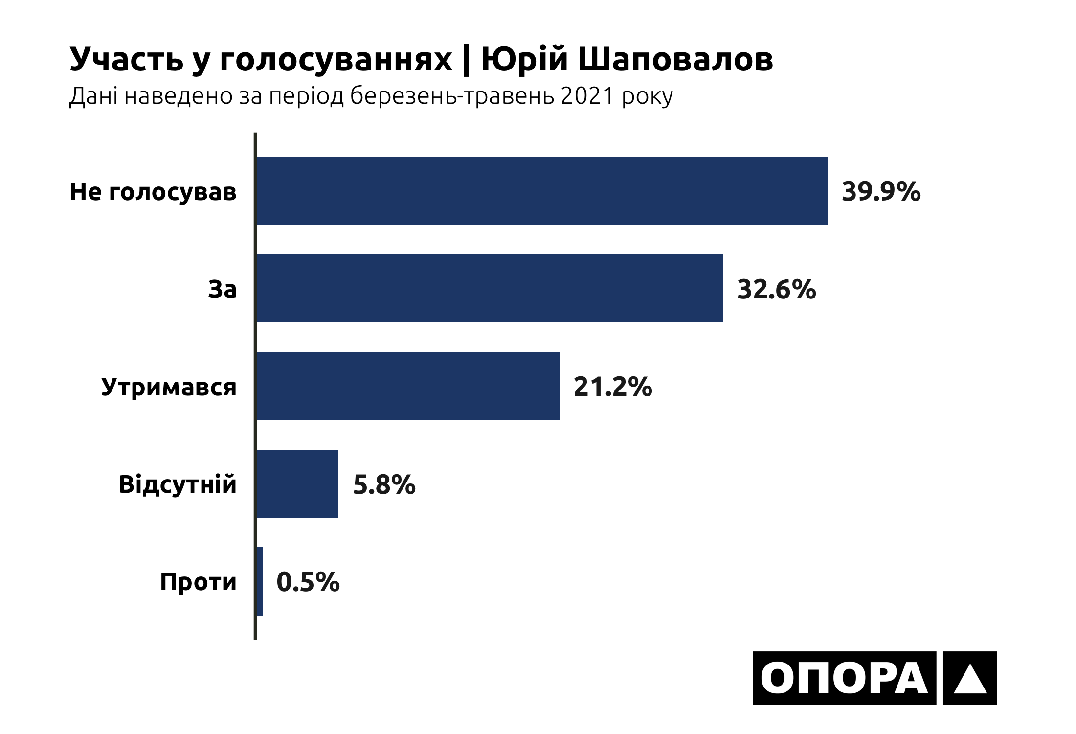 Навесні 2021 року найчастіше серед полтавських обранців голосував «За» представник депутатської групи «Партія «За майбутнє» Юрій Шаповалов (32,6%). У той же час, нардеп і найчастіше не голосував – більш ніж в третині випадків (39,9%).