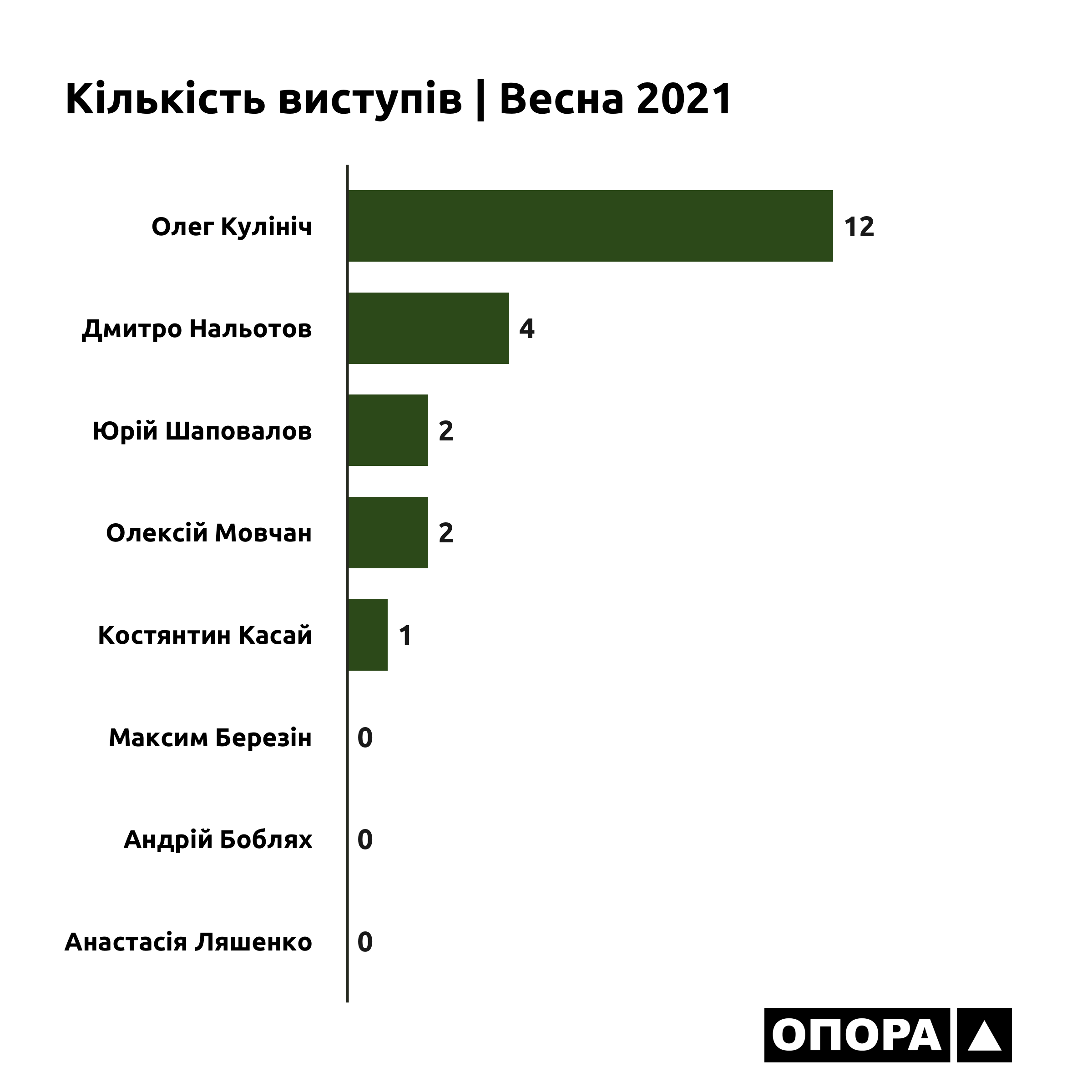 Лідером за кількістю та загальною тривалістю є Олег Кулініч, який виступив 12 разів (загалом 18 хв 26 с). Дмитро Нальотов має в своєму заліку 4 виступи загальною довжиною 2 хв 55 с. Олексій Мовчан загалом виступав 3 хв 27 с. Троє нардепів – Андрій Боблях, Анастасія Ляшенко та Максим Березін, взагалі не брали слова.