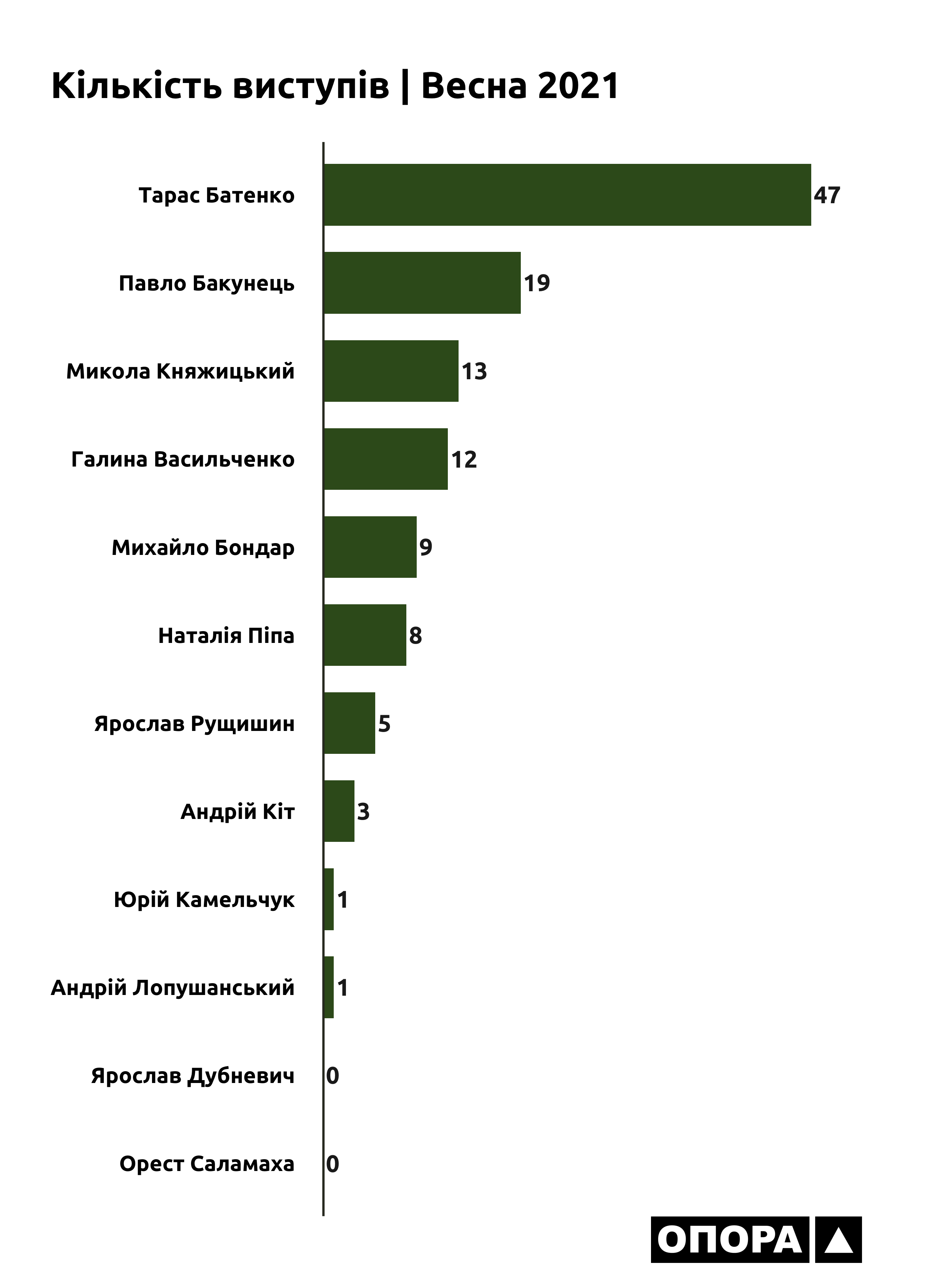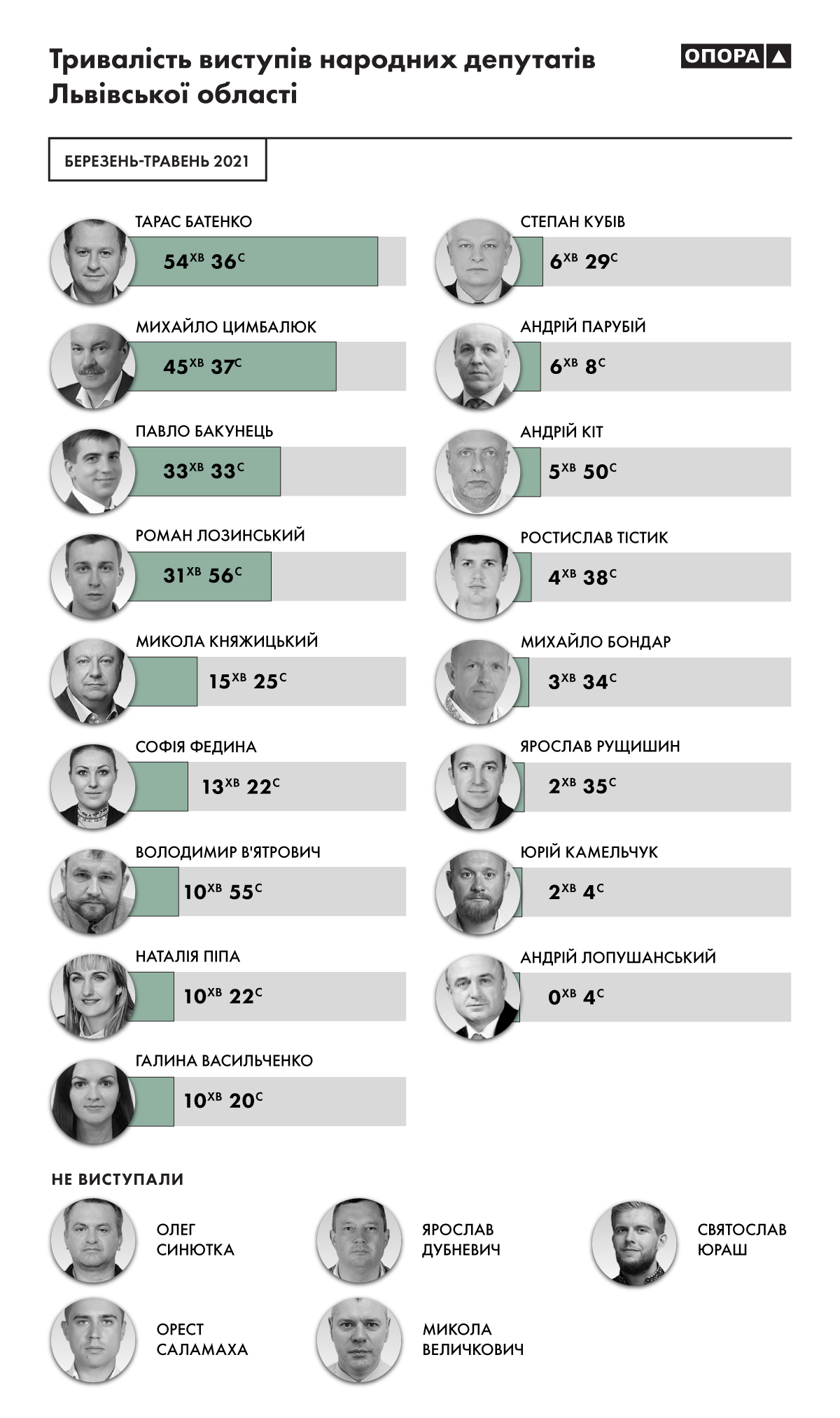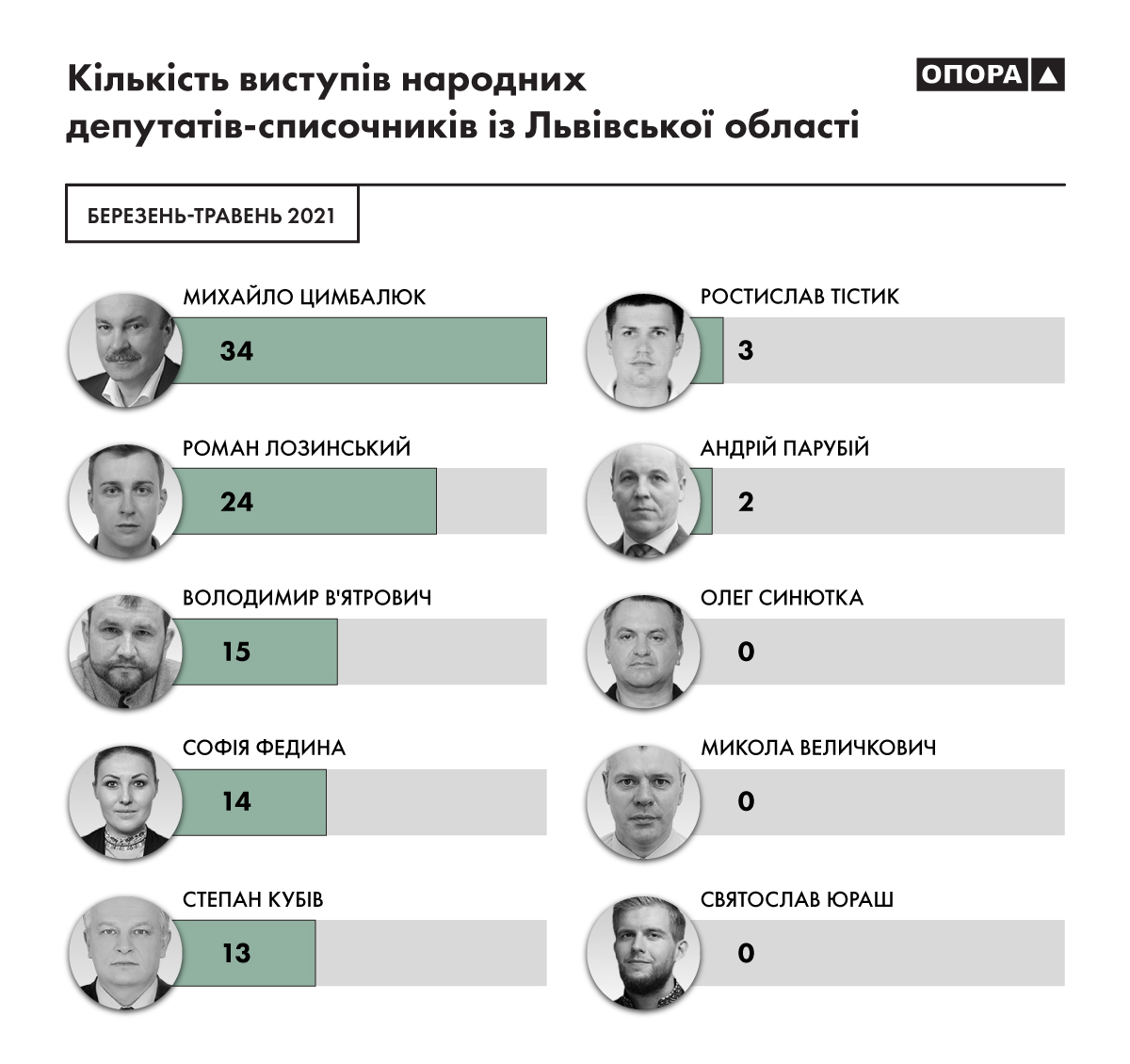 Завершальним компонентом дослідження є аналіз використання народними депутатами інструментом виступу під час пленарного засідання. Це добра нагода донести власну експертну думку та політичну позицію своєї фракції чи групи, представити результати законопроектної діяльності або озвучити проблему, з якою до нього звертаються виборці. Сумарно обранці Львівщини виступали у сесійній залі Верховної Ради 222 рази загальною тривалістю 4 години 24 хвилини. Найчастіше протягом весни серед львівських мажоритарників виступав Тарас Батенко, а серед депутатів-списочників – Михайло Цимбалюк. Перший брав слово 47 разів загальною тривалістю 55 хвилин, тоді як другий – 34 рази тривалістю 46 хвилин. Далі – Павло Бакунець 34 хвилини, Роман Лозинський 32 хвилини, Микола Княжицький 15 хвилин, Софія Федина 13 хвилин. По 10 хвилин виступали Володимир В’ятрович, Наталія Піпа та Галина Васильченко. Степан Кубів, Андрій Парубій та Андрій Кіт виступали по 6 хвилин, хоча тривалість кожного виступу була різною й, відповідно, загалом кількість виступів у них суттєво відрізняється. Жодного разу не скористались можливістю виступу Орест Саламаха, Ярослав Дубневич, Андрій Лопушанський, Олег Синютка, Микола Величкович і Святослав Юраш.