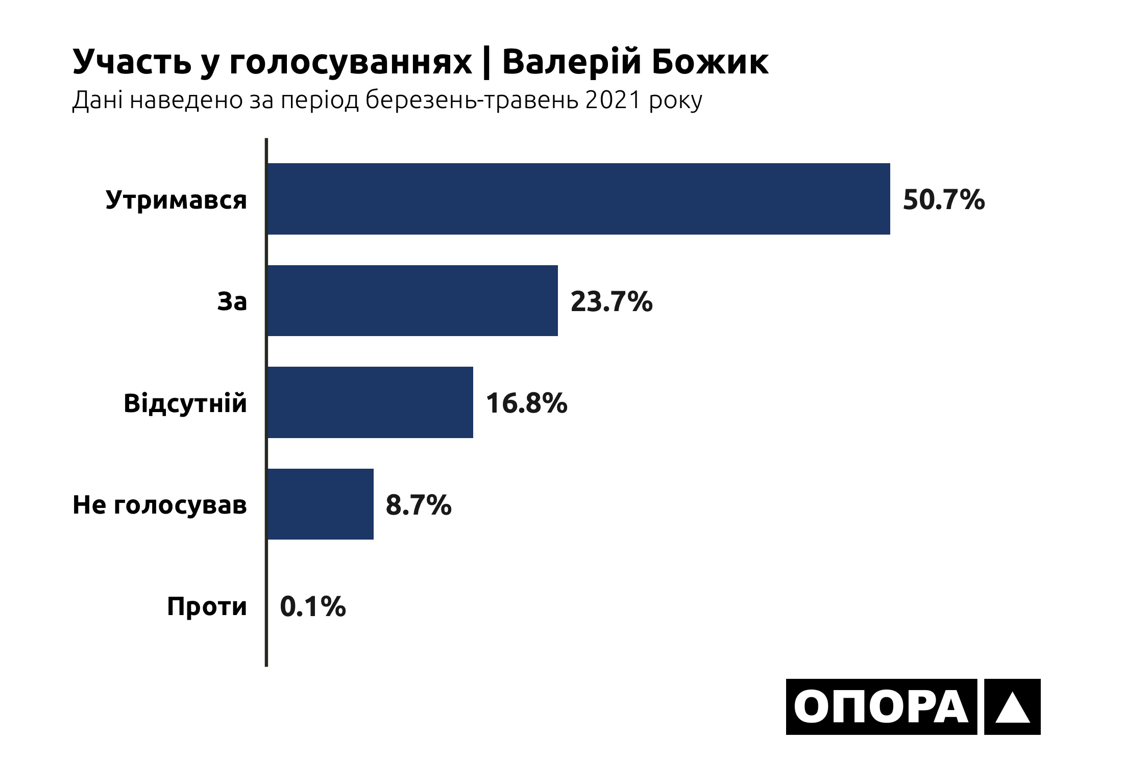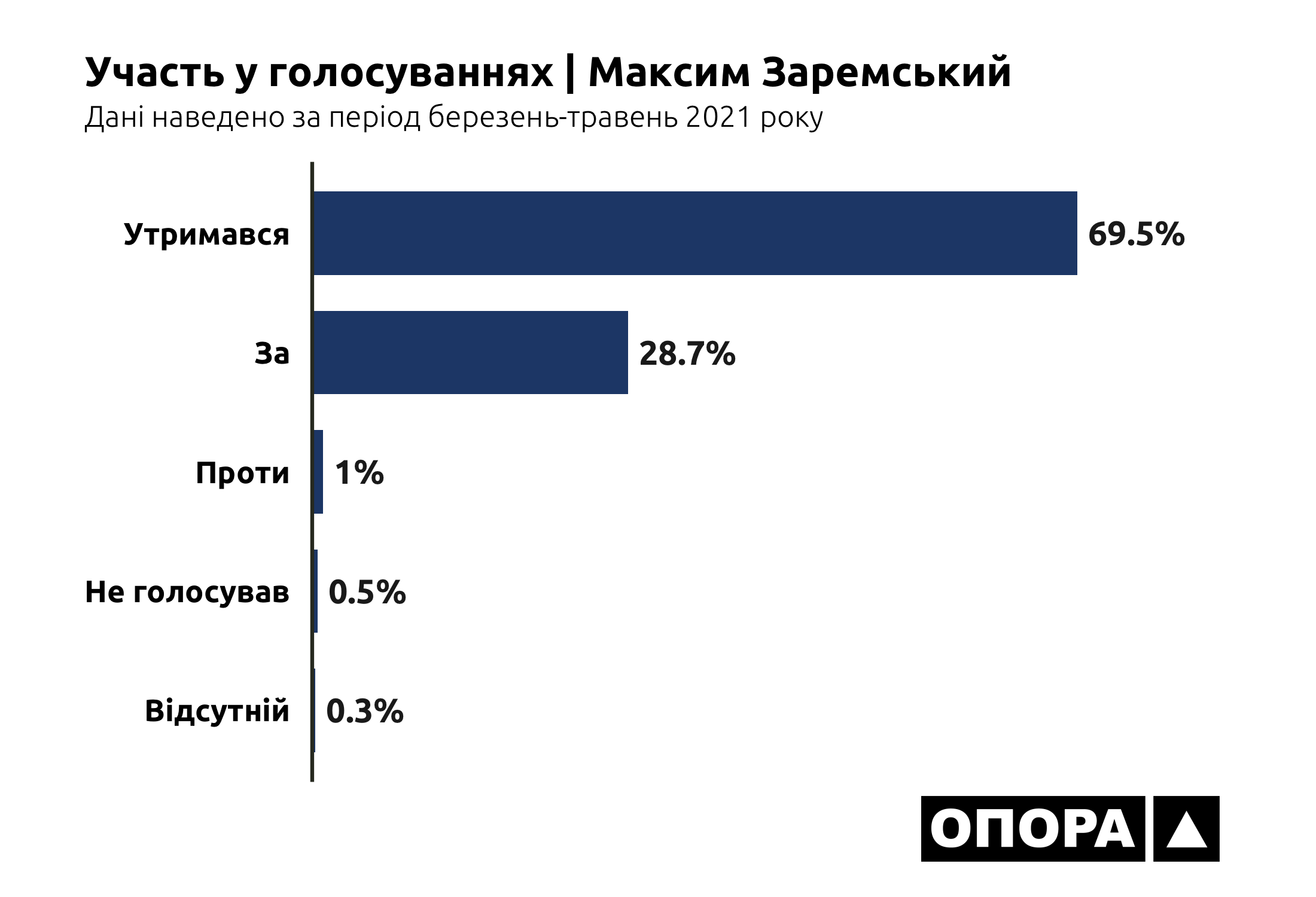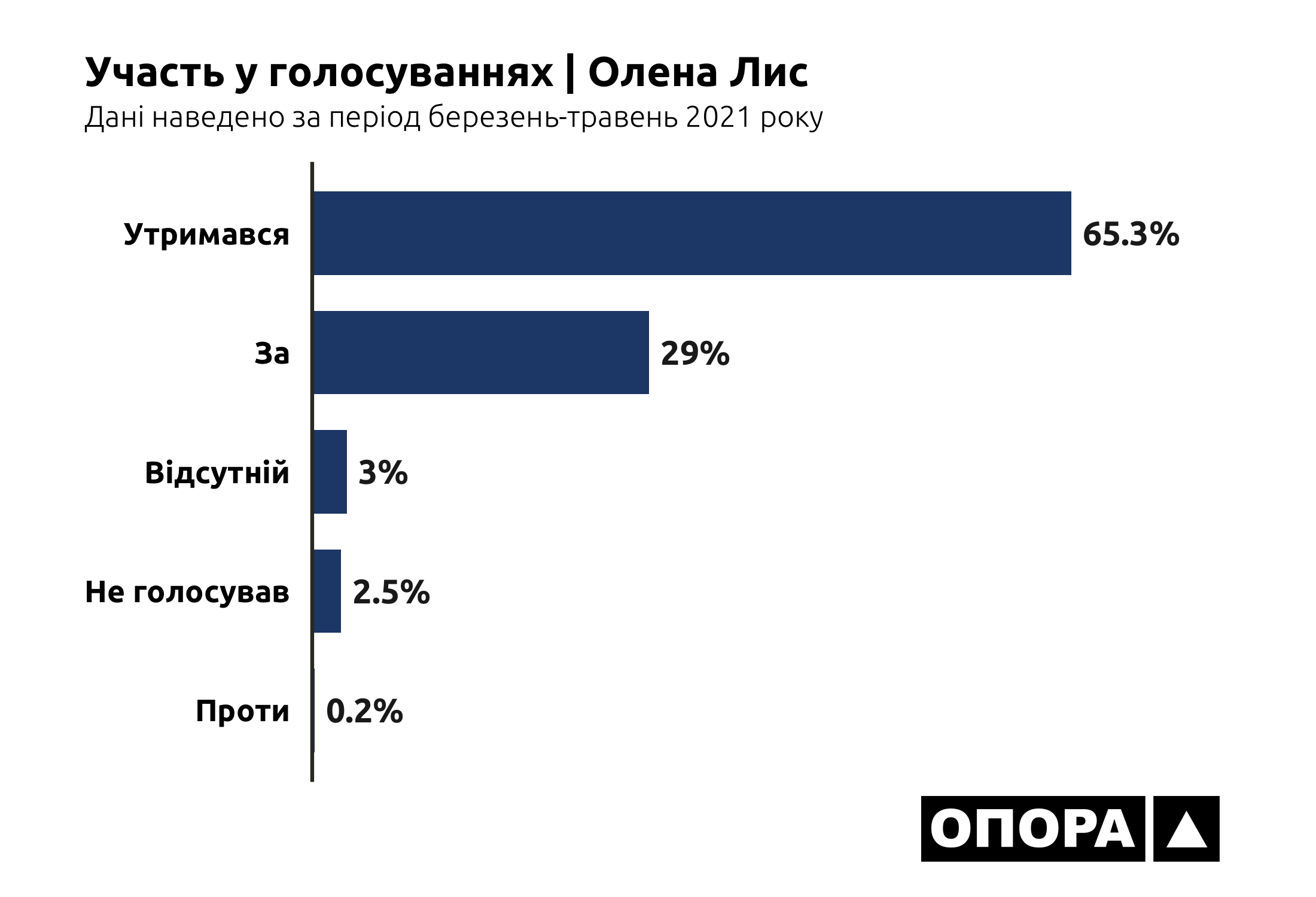 Максим Заремський не підтримав фракцію «Слуга народу» у 10,7% випадків, Валерій Божик – в 10,6%, а Олена Лис лише у 6,2%.