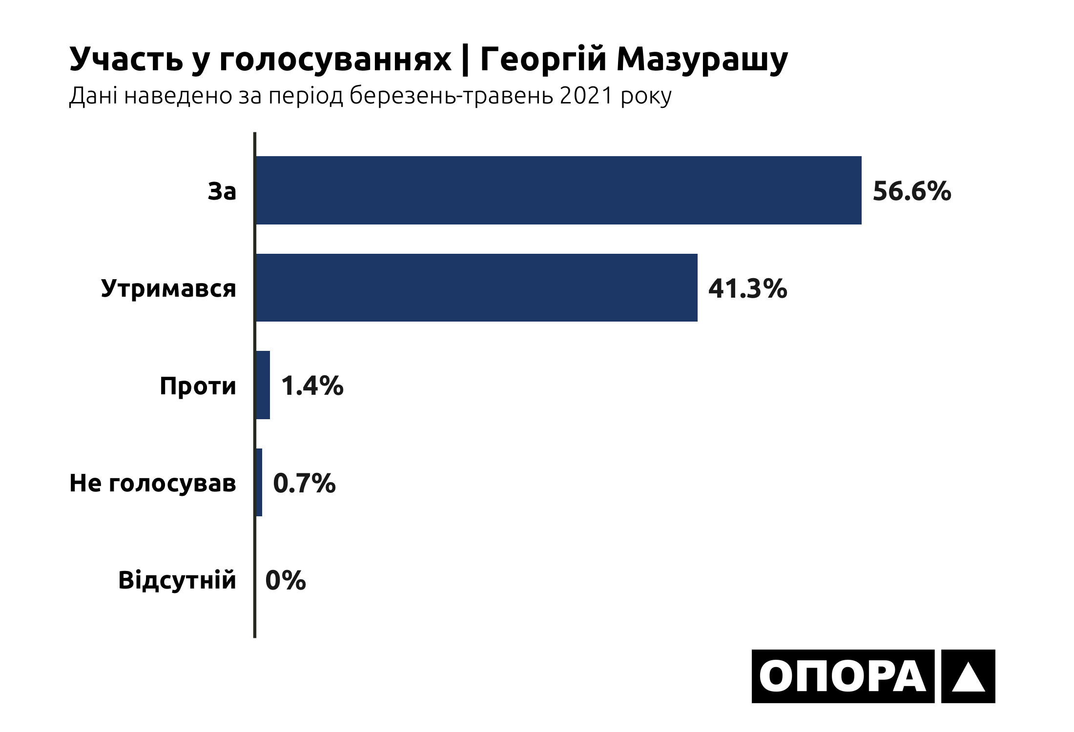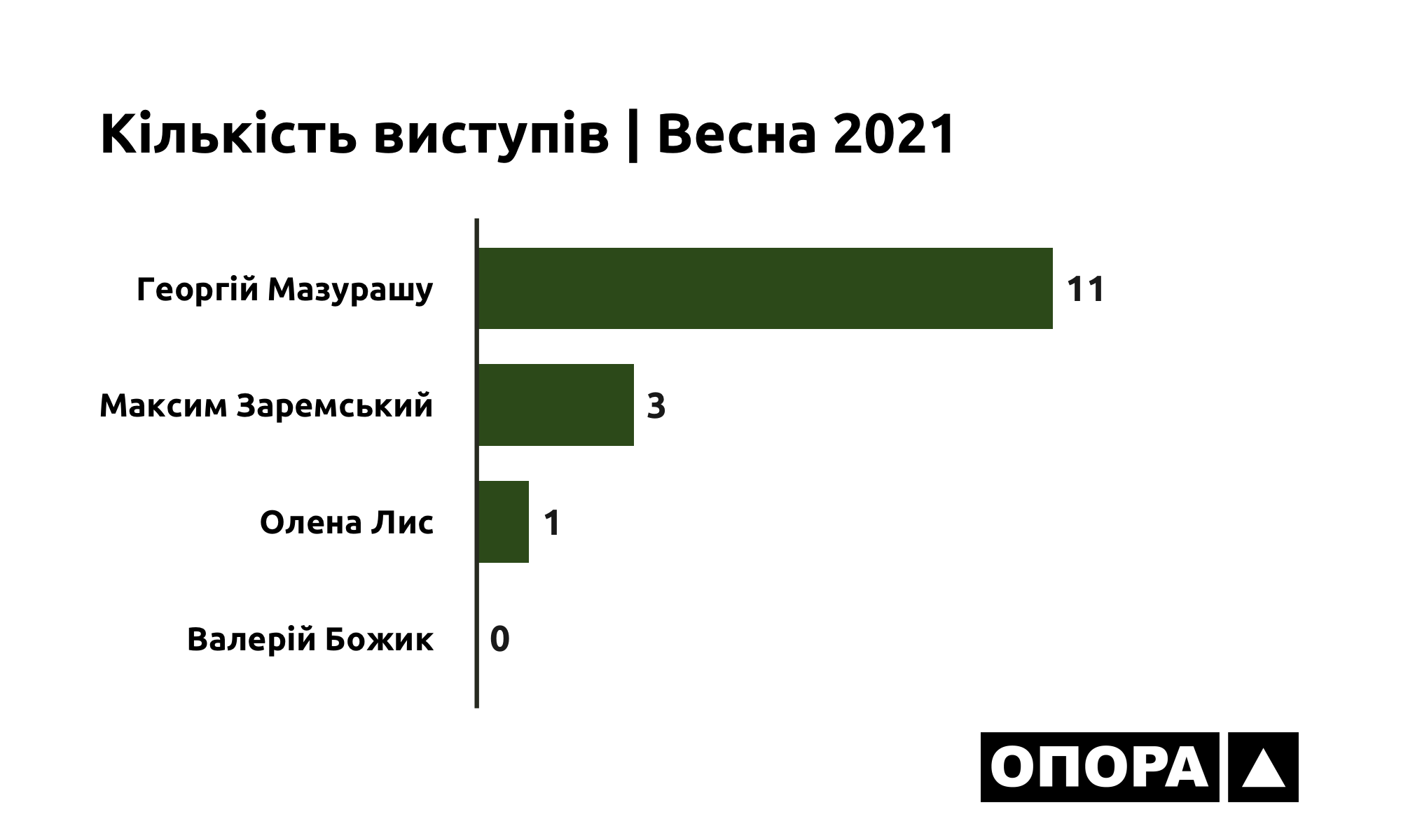 Впродовж трьох весняних місяців Георгій Мазурашу брав слово 11 разів. Загалом ж його виступи тривали 12 хвилин 55 секунд. Олена Лис брала слово лише один раз і говорила 2 хвилини 10 секунд, Максим Заремський хоч і «мав слово» тричі, проте проговорив лише 18 секунд. Валерій Божик впродовж весни 2021 року жодного разу слова не брав у стінах парламенту.