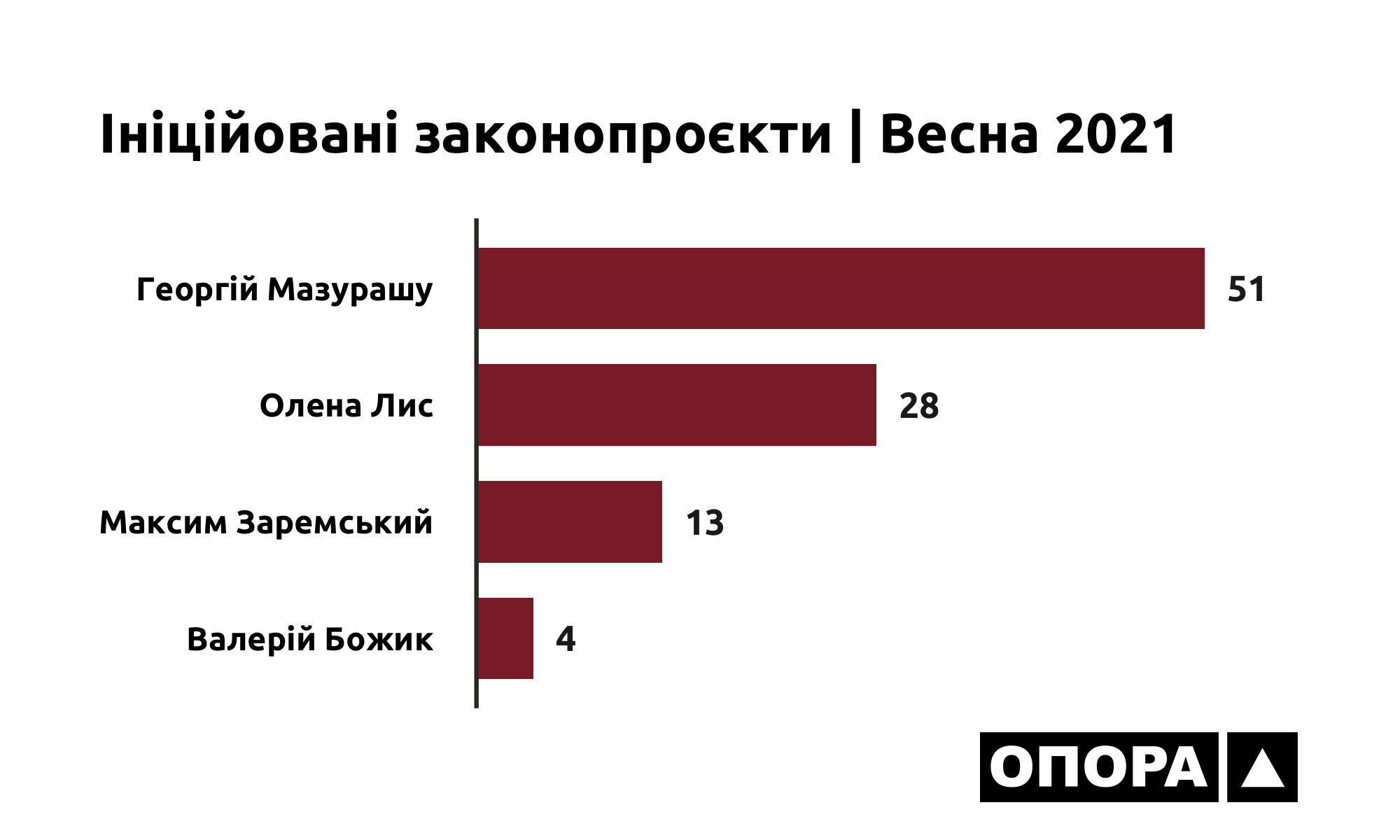 Усі нардепи-мажоритарники від Чернівецької області протягом весни 2021 року стали авторами чи співавторами 96 зареєстрованих законодавчих ініціатив (законопроєктів та проєктів постанов). Лідером не лише серед народних депутатів області, а й серед усіх нардепів став Георгій Мазурашу, зареєструвавши 51 законопроєкт. Олена Лис зареєструвала 28 проєктів законів, Максим Заремський 13, а Валерій Божик лише 4.