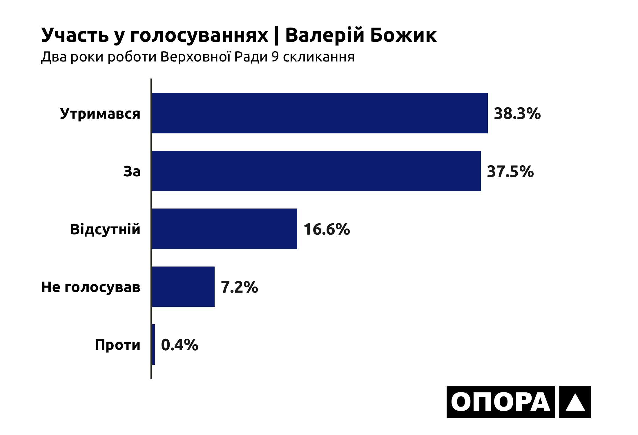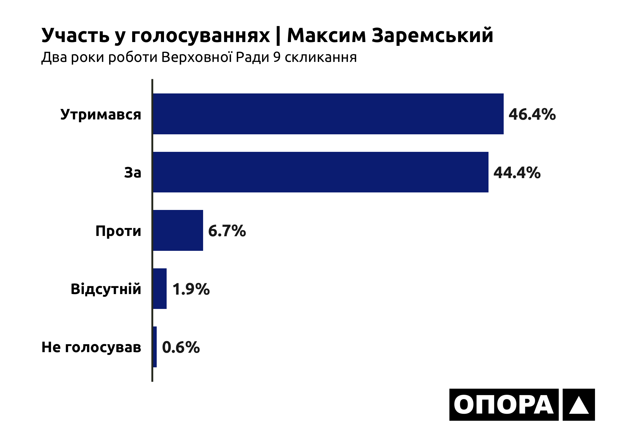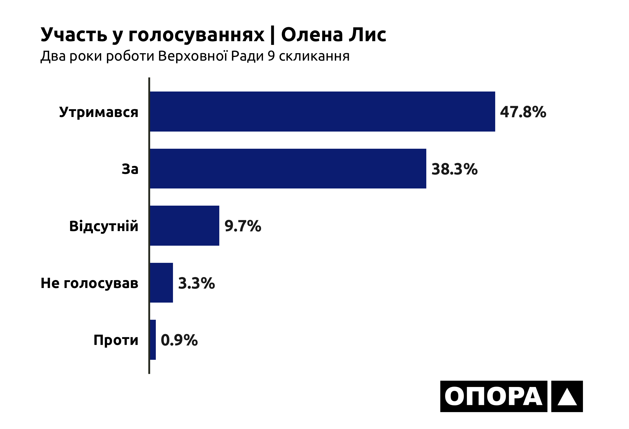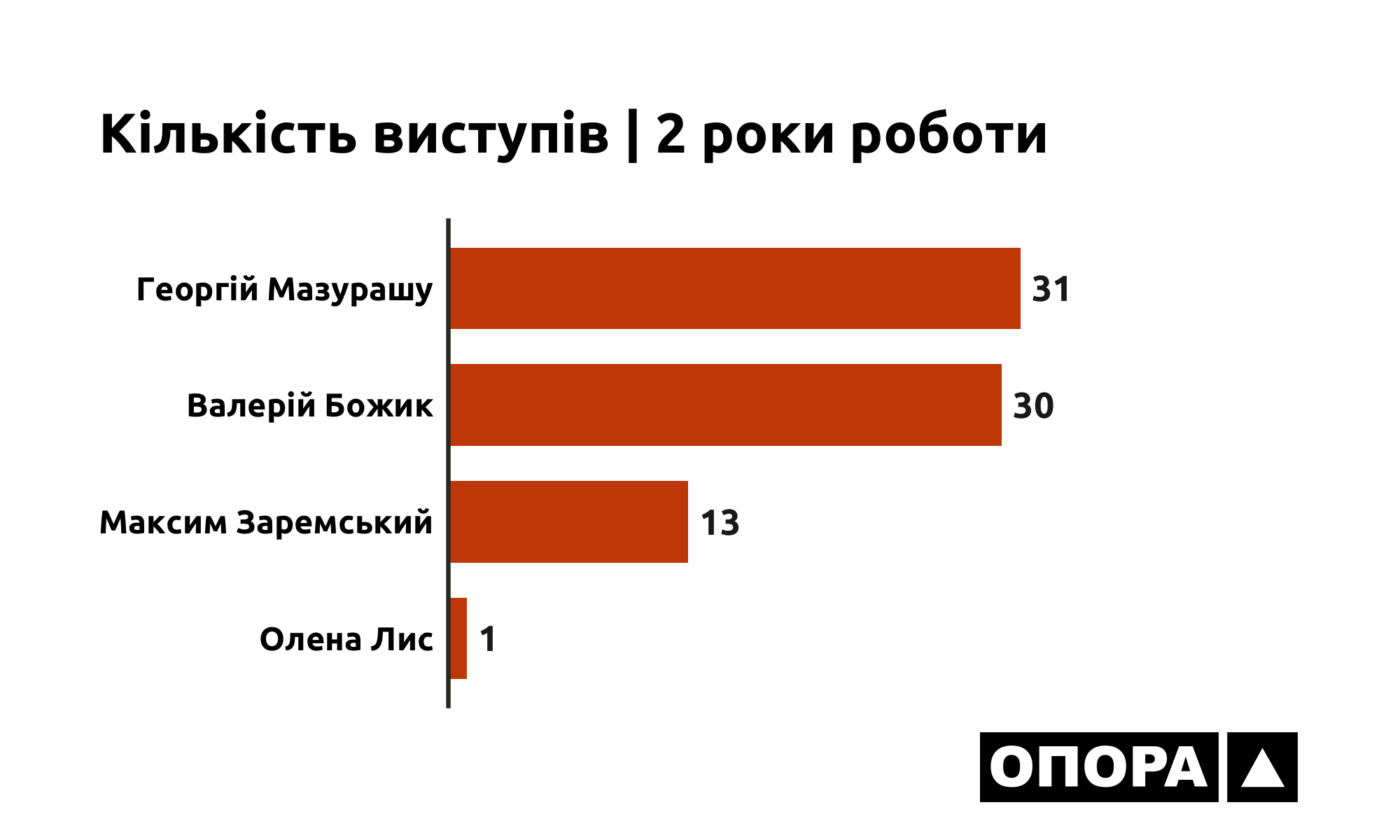 Олена Лис «утрималась» під час 47,8% голосувань. Майже стільки ж «утримувався» і Максим Заремський – 46,4%. Трохи менші показники у Георгія Мазурашу та Валерія Божика – 38,7 та 38,3% відповідно.