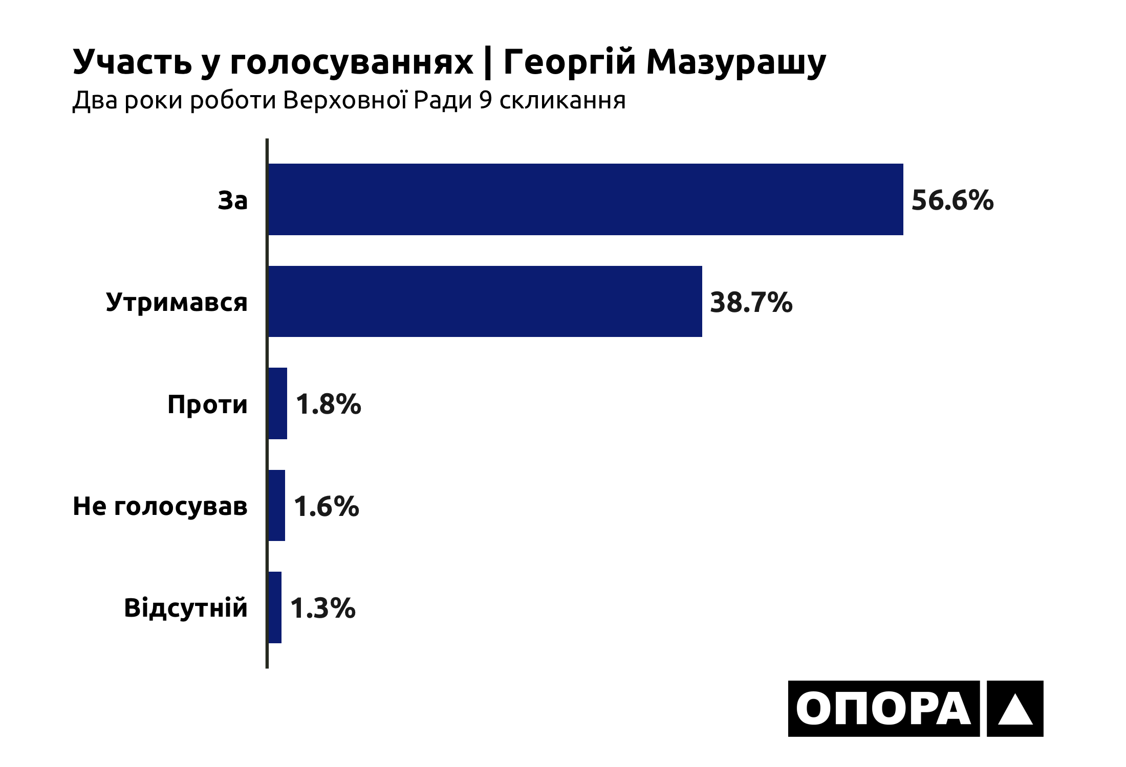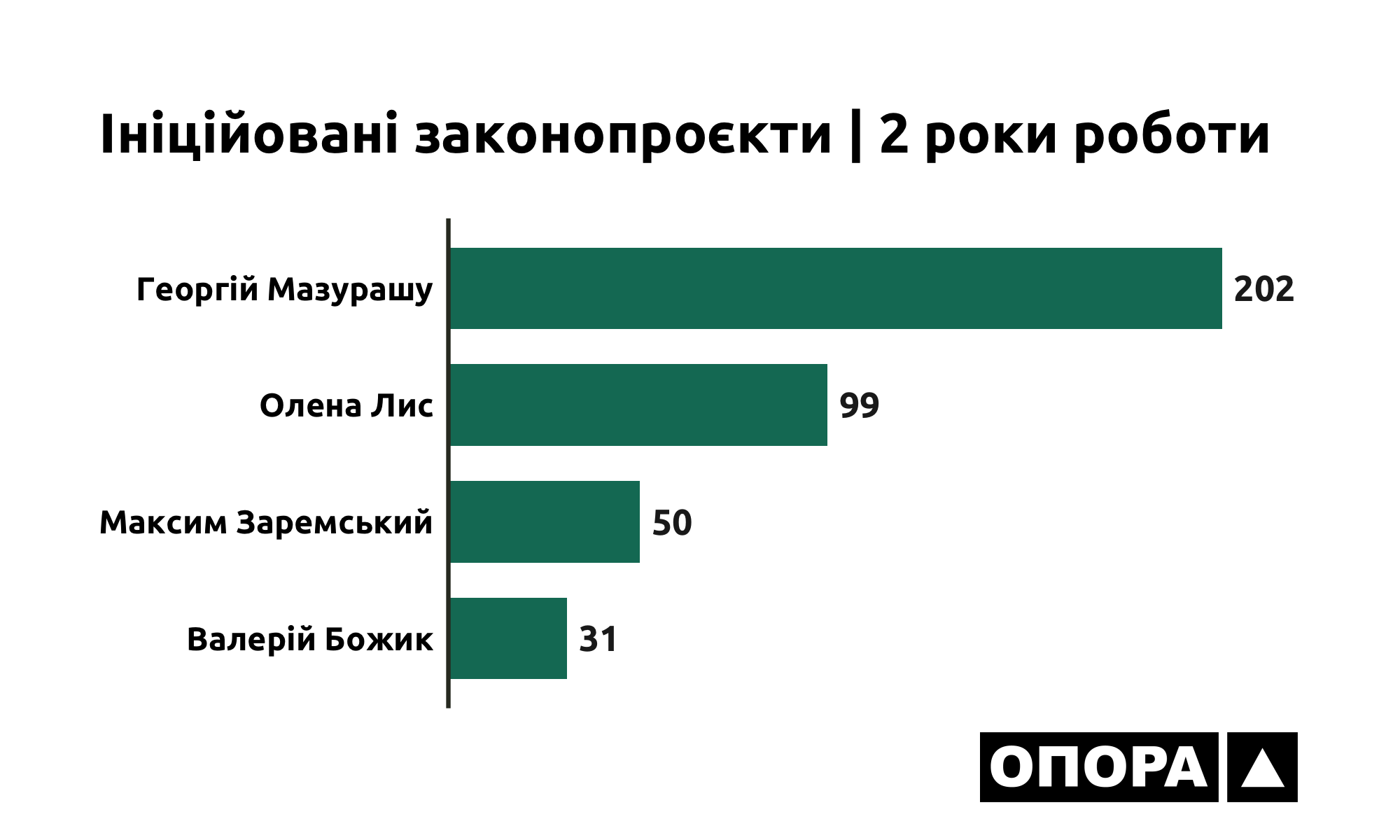 Представник Чернівецької області у парламенті Георгій Мазурашу є одним із найактивніших депутатів у розрізі зареєстрованих законопроєктів. За два роки роботи ініціював 202 законопроєкти, що є третім найбільшим показником серед усіх мажоритарників країни та більше, ніж усі мажоритарники Тернопільської області разом (цей показник становить 149). Найбільше його проєктів стосувалися економічної політики 30,7%. Трохи менше галузевого розвитку та правової політики – 23,8% та 23,3% відповідно. Решта ж стосувалися державного будівництва (7,4%), гуманітарної політики (5,9%), безпеки і оборони (4,9%) та соціальної політики (4%). Більшість цих проєктів опрацьовується в комітетах (108 або 53,5%), ще частина (25 або 12,4%) очікує розгляду. Підписано ж лише 11 або 5,4% законопроєктів депутата. Загалом знято з розгляду 30 проєктів або 14,8%.