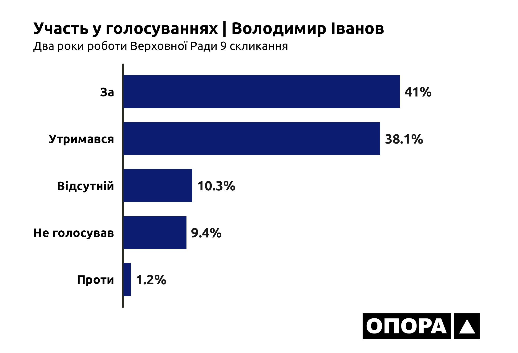 Володимир Іванов був відсутній на 983 голосуваннях (10,3%). За два роки роботи у Верховній Раді депутат найчастіше голосував «за» – 3926 разів (41%). У 38,1% випадків, що становить 3656 голосувань, мажоритарник утримувався, 898 разів (9,4%) – не голосував, 119 разів – був «проти».