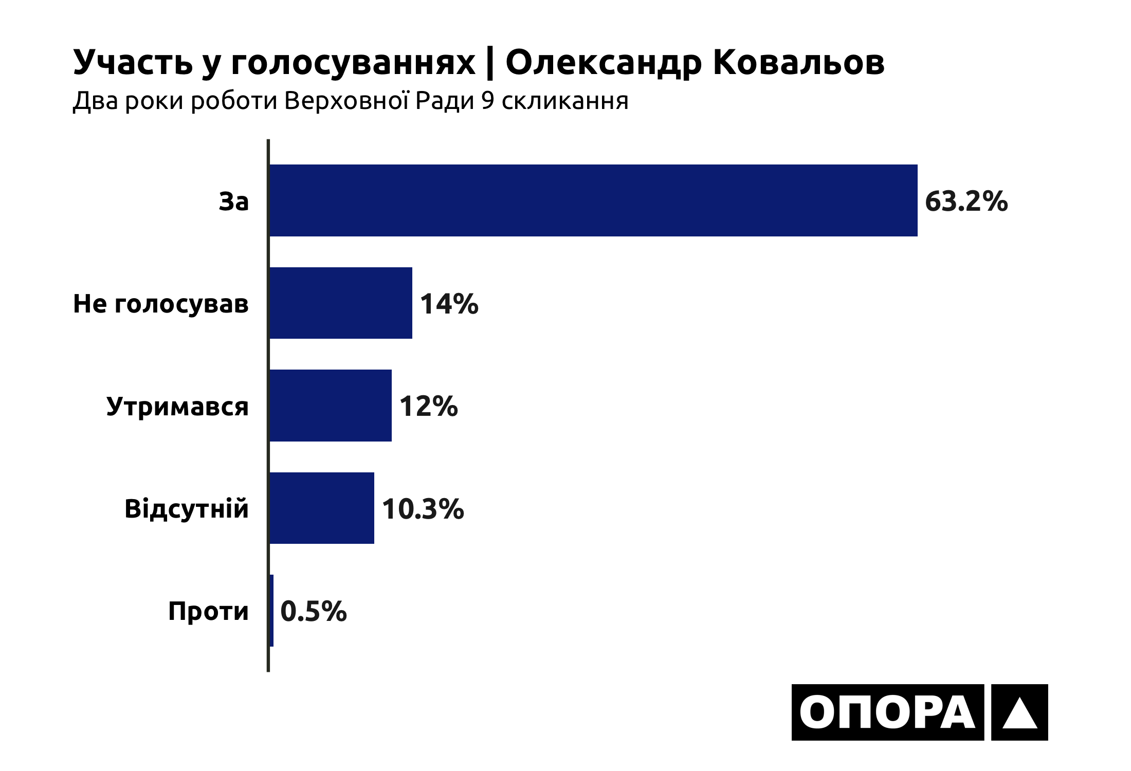Олексій Ковальов здебільшого утримувався (4072 рази – 42,5%) та голосував «за» (3805 разів – 39,7%). Депутат пропустив найменше голосувань серед інших херсонських мажоритарників – 492 (5,1%). Кнопку «проти» Олексій Ковальов натиснув 228 разів (2,4%), зовсім не голосував – 985 разів (10,3%).