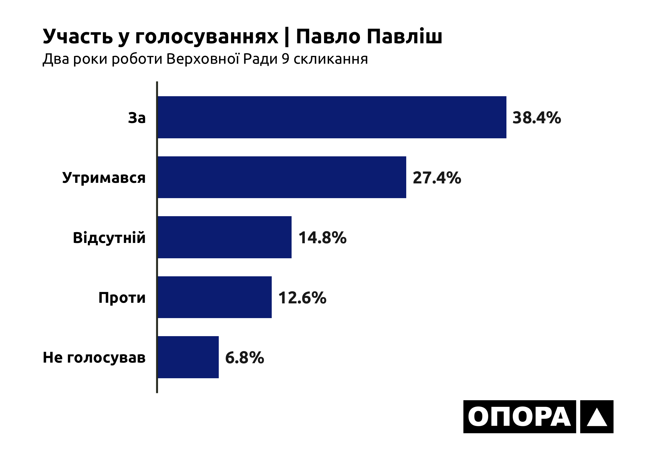 Мажоритарник Павло Павліш найменше серед херсонських депутатів тиснув кнопку «утриматися» – 2629 разів (27,4%). «За» депутат голосував 3680 разів (38,4%), «проти» – 1207 разів (12,6%). 1413 голосувань (14,8%) депутат пропустив, ще 653 рази (6,8%) – не голосував.