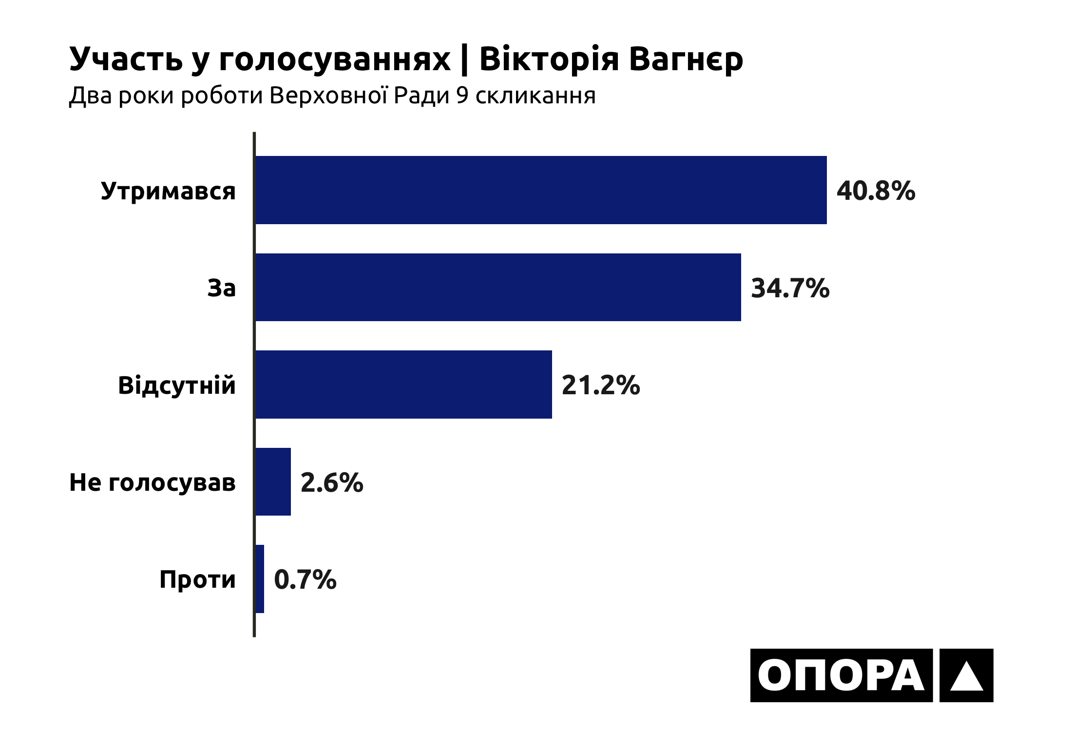 Серед херсонських мажоритарників найбільше голосувань пропустила Вікторія Вагнєр – 21,2% випадків, що становить 2032 голосування. Найчастіше депутатка натискала на кнопки «утрималася» та «за» – 3910 разів (40,8%) та 3322 рази (34,7%) відповідно. У 252 випадках (2,6%) Вагнєр не голосувала, 66 разів була «проти».
