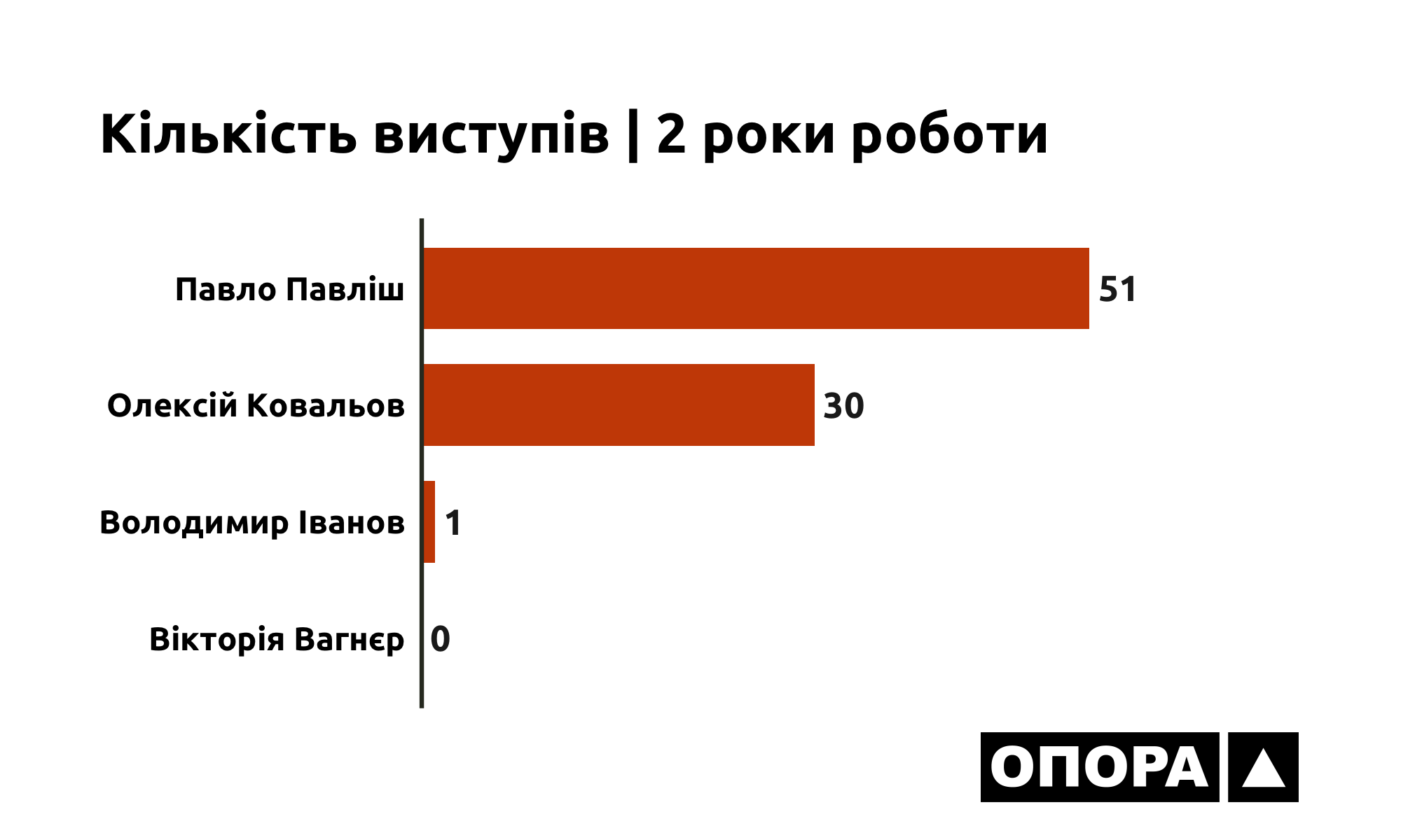 Потягом двох років у Верховній Раді херсонські мажоритарники виступали 82 рази. Їхні виступи загалом тривали майже 54 хвилини. Олексій Ковальов говорив 30 разів – 27 хвилин 15 секунд. Павло Павліш сумарно виступав 51 раз загальною тривалістю виступів 26 хвилин 16 секунд. Володимир Іванов говорив лише 1 раз – 3 секунди. Зовсім не брала слово Вікторія Вагнєр.
