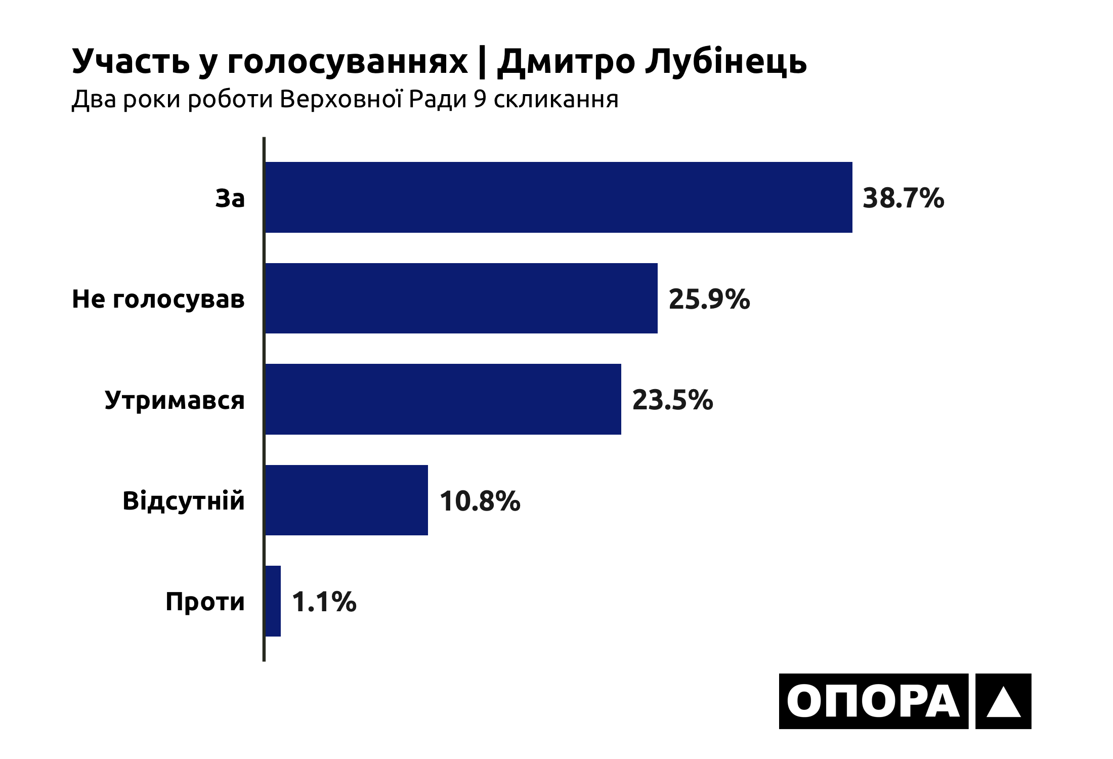 Представник депутатської групи «За майбутнє» Дмитро Лубінець частіше голосував «за» ту чи іншу пропозицію в парламенті – 3703 рази (38,7%). Не голосував, будучи присутнім на засіданні – 2481 раз (25,9%), утримався – 2252 (23,5%), проголосував проти у 109 випадках (1,1%). А не відвідував засідання під час 1037 голосувань (10,8%).