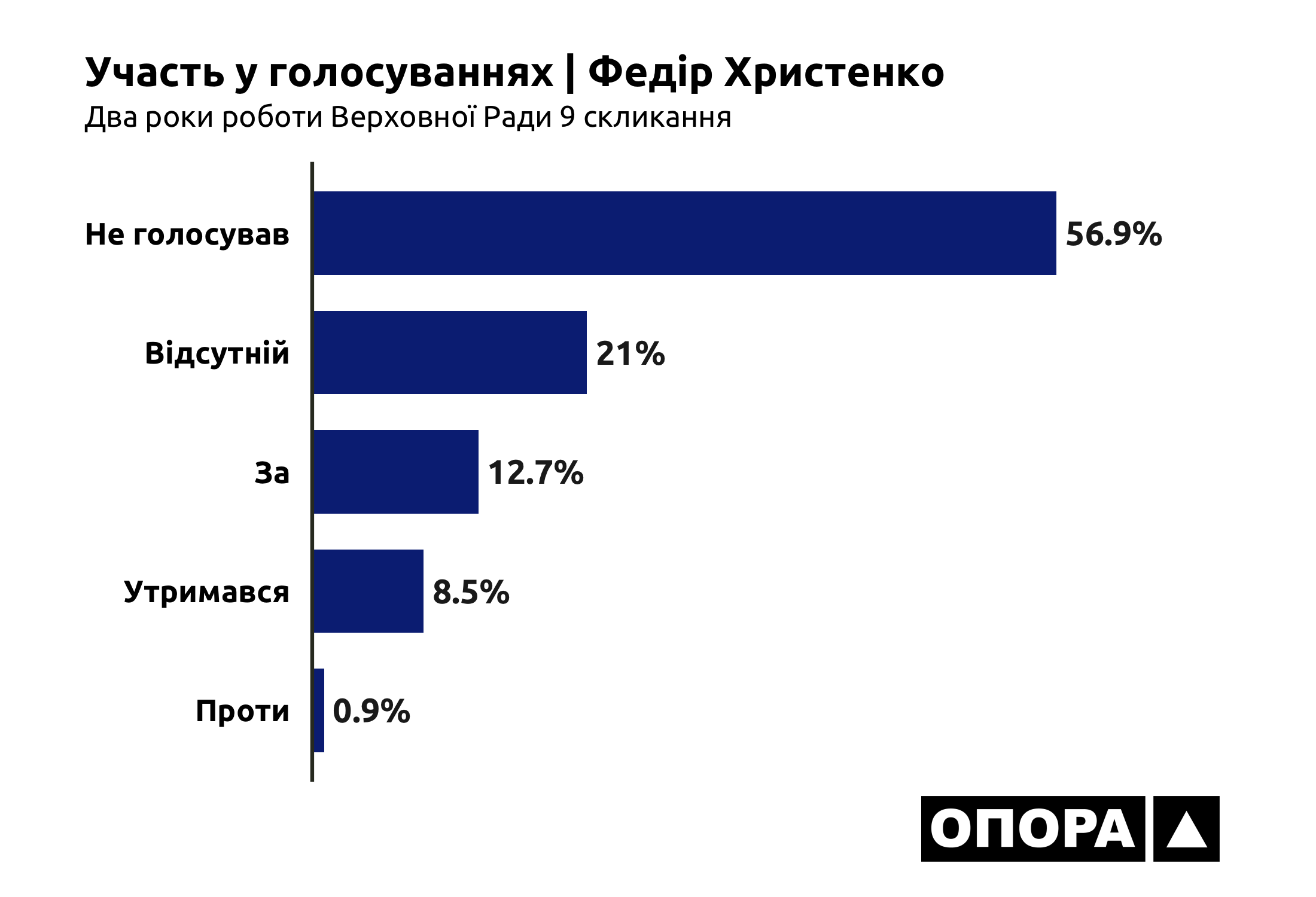 Його колега по фракції «Опозиційна платформа – За життя» Федір Христенко відвідує більшу частину засідань, але при цьому не голосує – за 2 роки так він чинив при 5455 (56,9%) голосуваннях. При 2014 (21%) голосуваннях нардеп був відсутній. У 1219 (12,7%) випадках він проголосував за, 812 (8,5%) раз утримався і 82 (0,9%) проголосував проти.