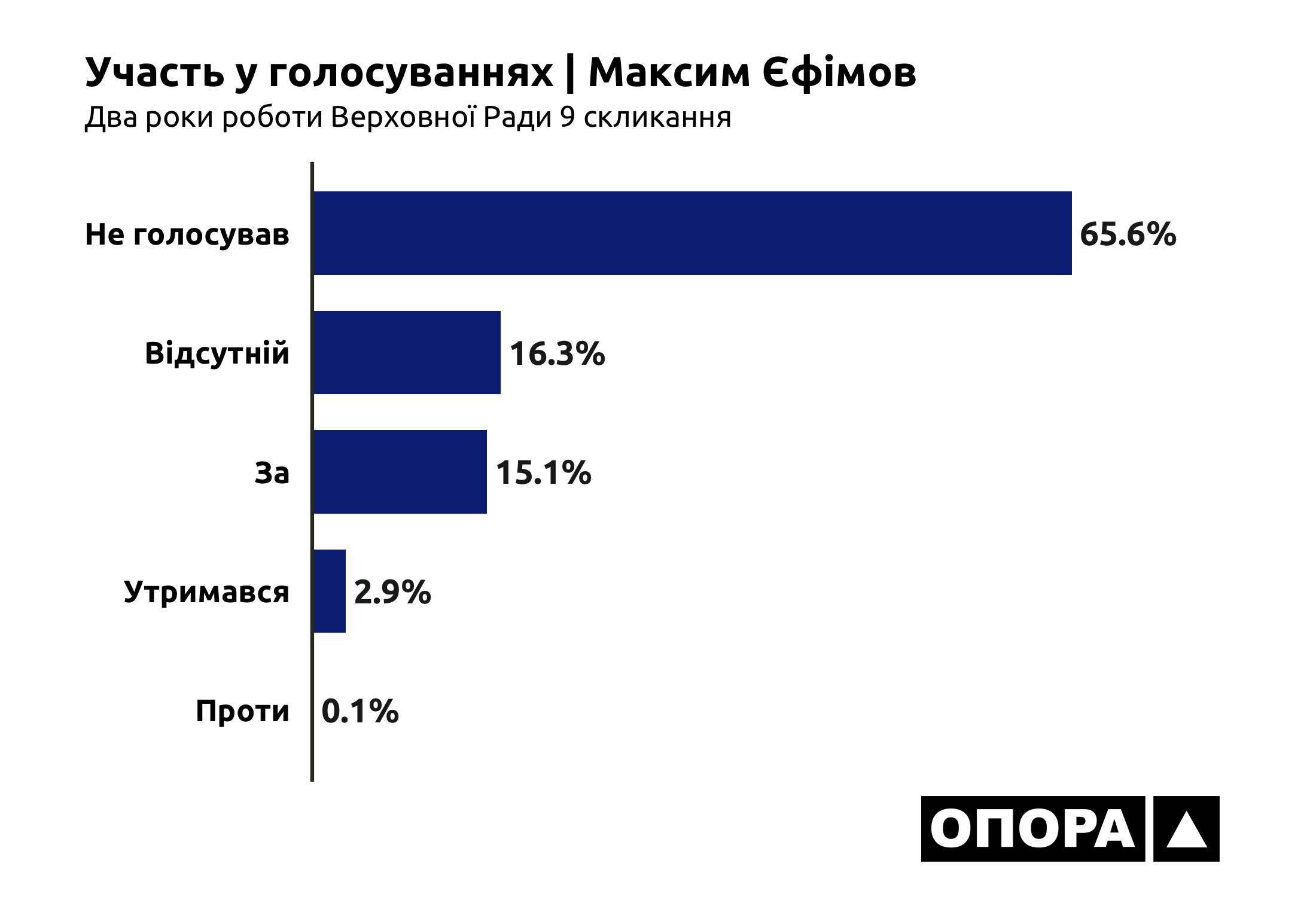 Адміністративний центр Донецької області – місто Краматорськ представляє Максим Єфімов від депутатської групи «Довіра», обраний по 48 виборчому округу. Якщо говорити про всі голосування, то більшу частину нардеп просто не голосував, навіть будучи присутнім у Верховній Раді – це 6286 голосувань або 65,6%. Ще під час 1566 (16,3%) голосувань Максим Єфімов був відсутній. Відповідно в 1444 (15,1%) випадках він проголосував схвально, в 273 (2,9%) випадках утримався і тільки 13 (0,1%) разів за 2 роки голосував проти.
