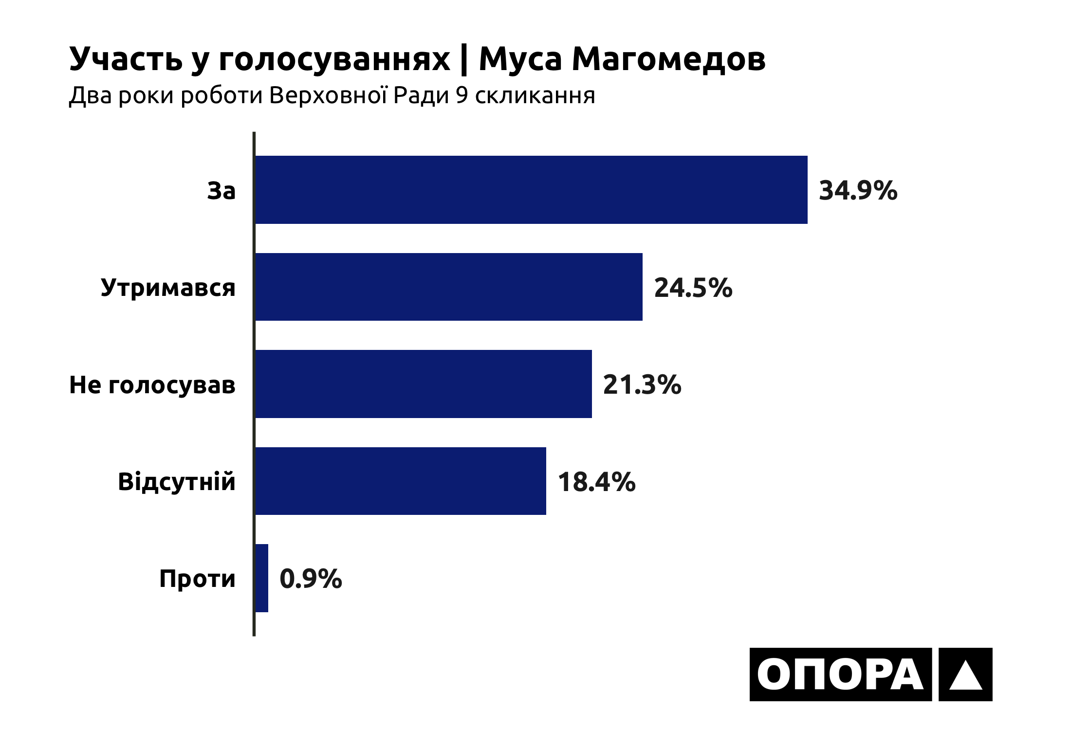 Ще один позафракційний мажоритарник Муса Магомедов більшу частину голосувань в парламенті голосує схвально – він натискав «за» 3341 (34,9%) раз. Вирішив утриматися при 2344 (24,5%) голосуваннях, не голосував 2042 (21,3%), був відсутній при 1763 (18,4%) голосуваннях, а проти був тільки 92 рази (0,9%).