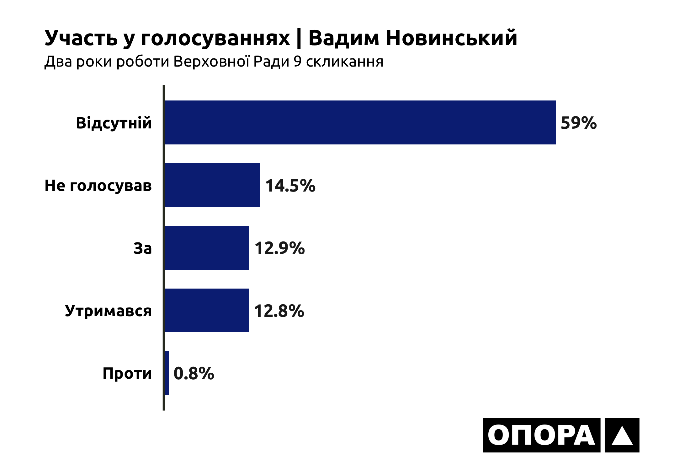Позафракційний Вадим Новинський зазвичай не відвідує засідання Верховної Ради – був відсутній при 5652 голосуваннях, а це 59%. Ще в 1388 (14,5%) випадках не голосував, уже будучи на засіданні. Кнопку «утримався» він натискав 1230 (12,8%) разів. Залишається не так багато на розгляд законодавчих ініціатив: а саме при 1240 (12,9%) голосуваннях депутат був «за» та при 72 (0,8%) проти.