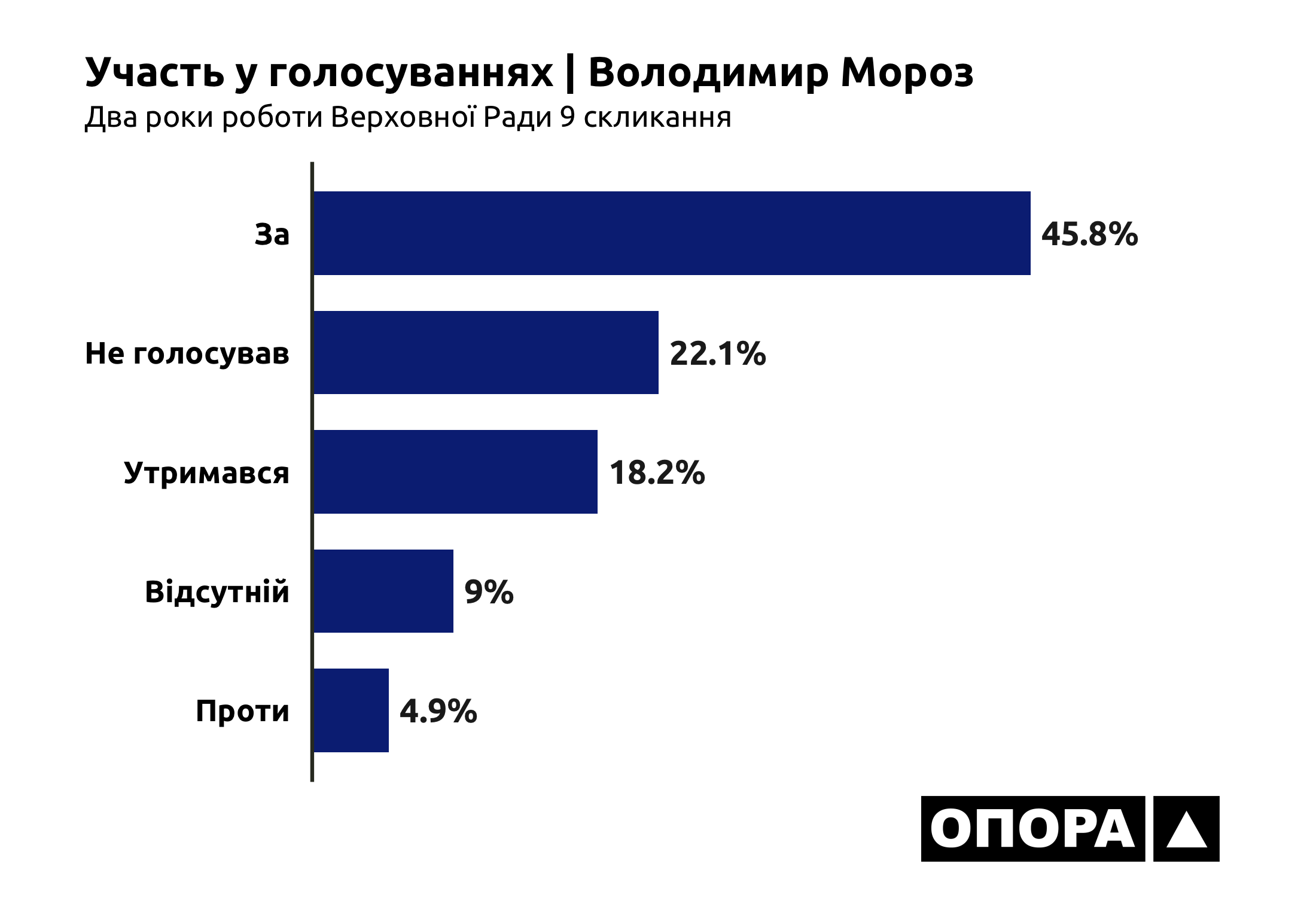 Його колега по фракції «Опозиційна платформа – За життя» Володимир Мороз має подібні показники роботи в Раді. Він голосував схвально 4391 раз або 45,8%. Не голосував взагалі 2115 раз (22,1%), утримався при 1748 голосуваннях (18,2%), був проти 467 раз (4,9%). І не був присутнім на засіданнях під час 861 голосування (9%).