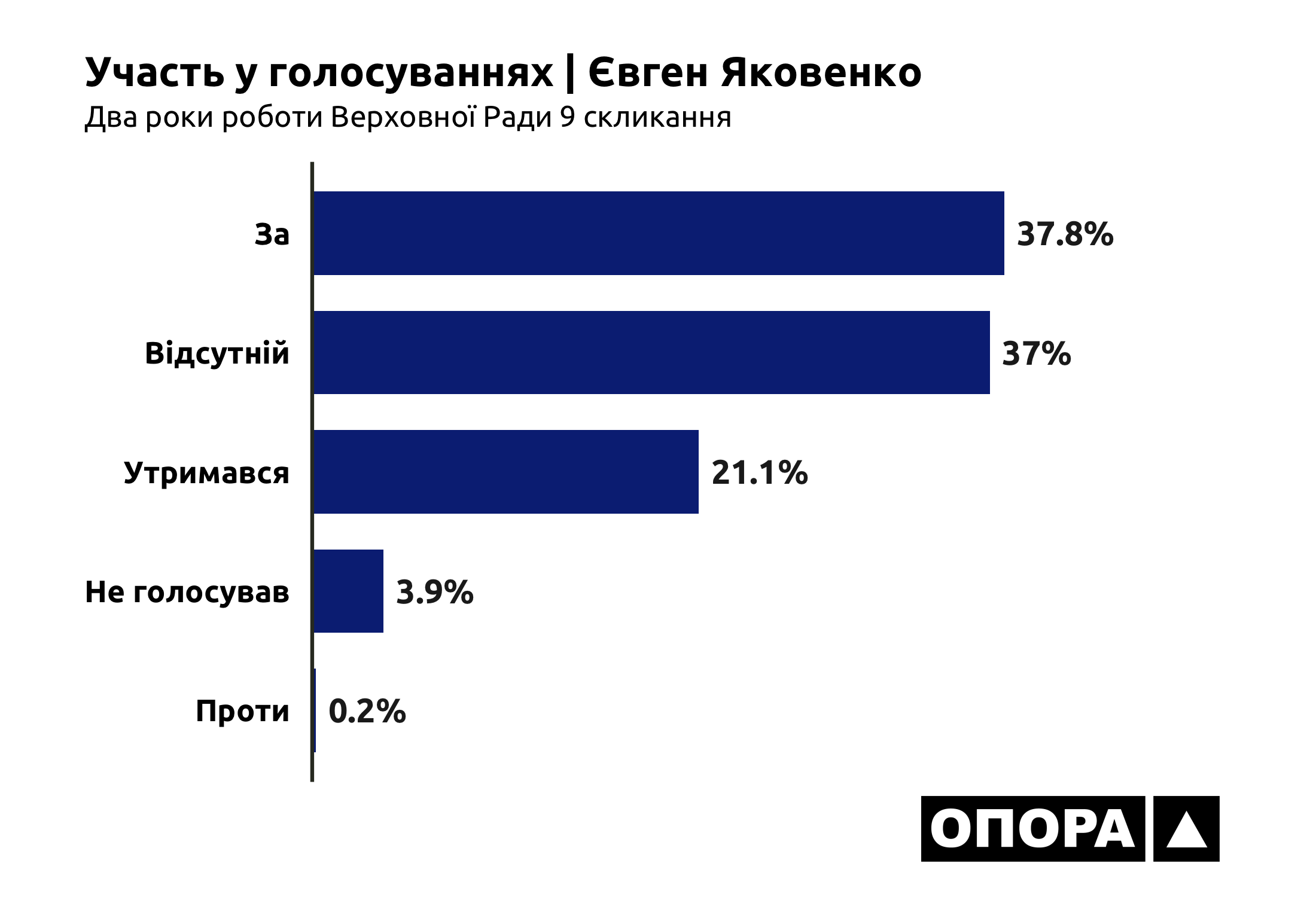Схожа динаміка й у позафракційного Євгена Яковенка. Голосуючи за законодавчі ініціативи він 3623 (37,8%) рази обирав «за». Щоправда, майже стільки ж він був відсутній – при 3544 (37%) голосуваннях. Рішення утриматися Євген Яковенко обрав при 2021 (21,1%) голосуванні. Не голосував взагалі 378 (3,9%) разів. А був проти представлених на розгляд законопроєктів при 16 (0,2%) голосуваннях.