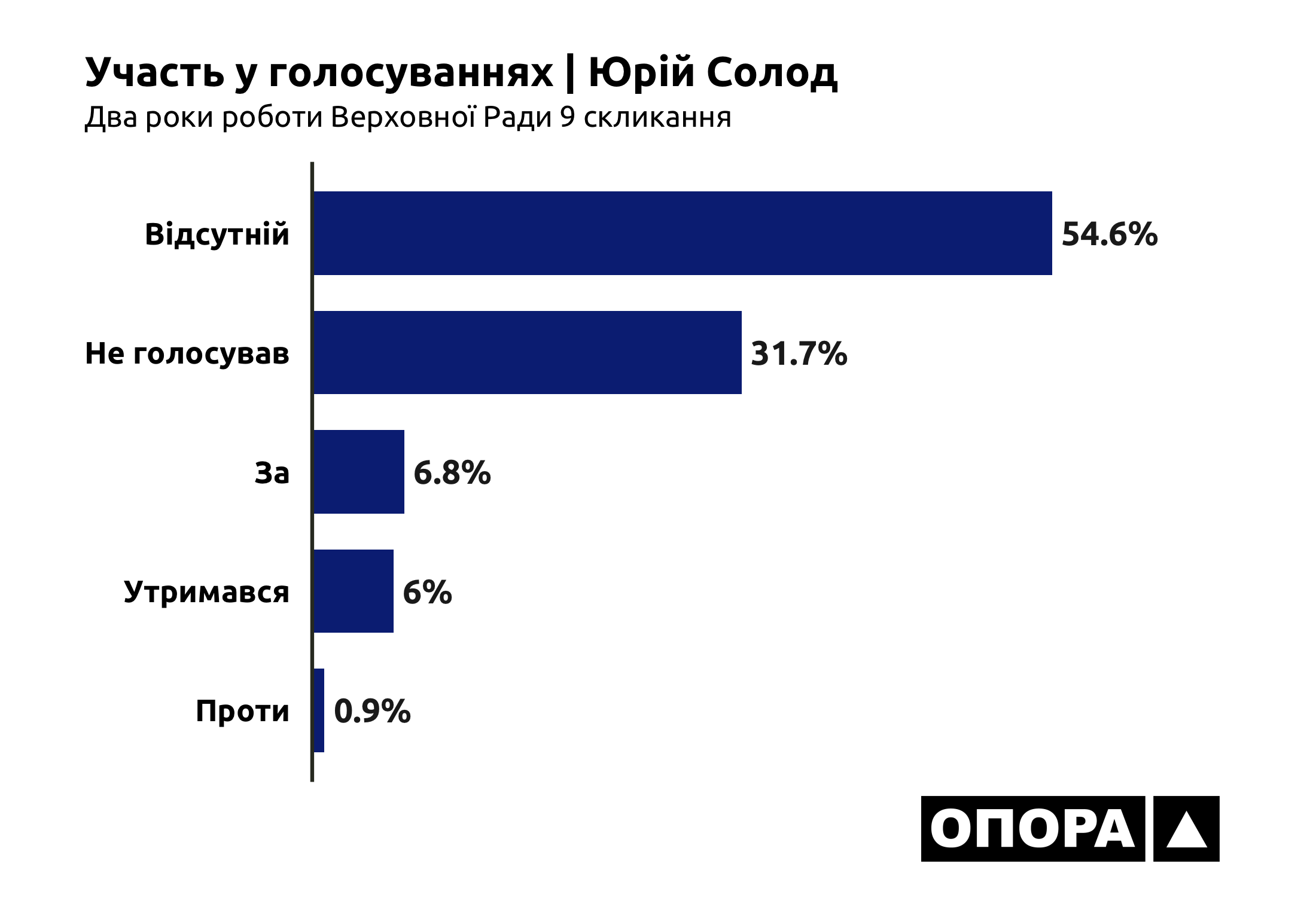 Що стосується Юрія Солода, який обирався в 47 окрузі з центром у Слов’янську від партії «Опозиційна платформа – За життя», то більшу частину часу він був відсутній – 5228 (54,6%) голосувань. І ще в 3037 (31,7%) випадках Юрій Солод не голосував. «За» нардеп був 651 (6,8%) раз, утримався – 580 (6%), проти – 86 (0,9%) голосувань.