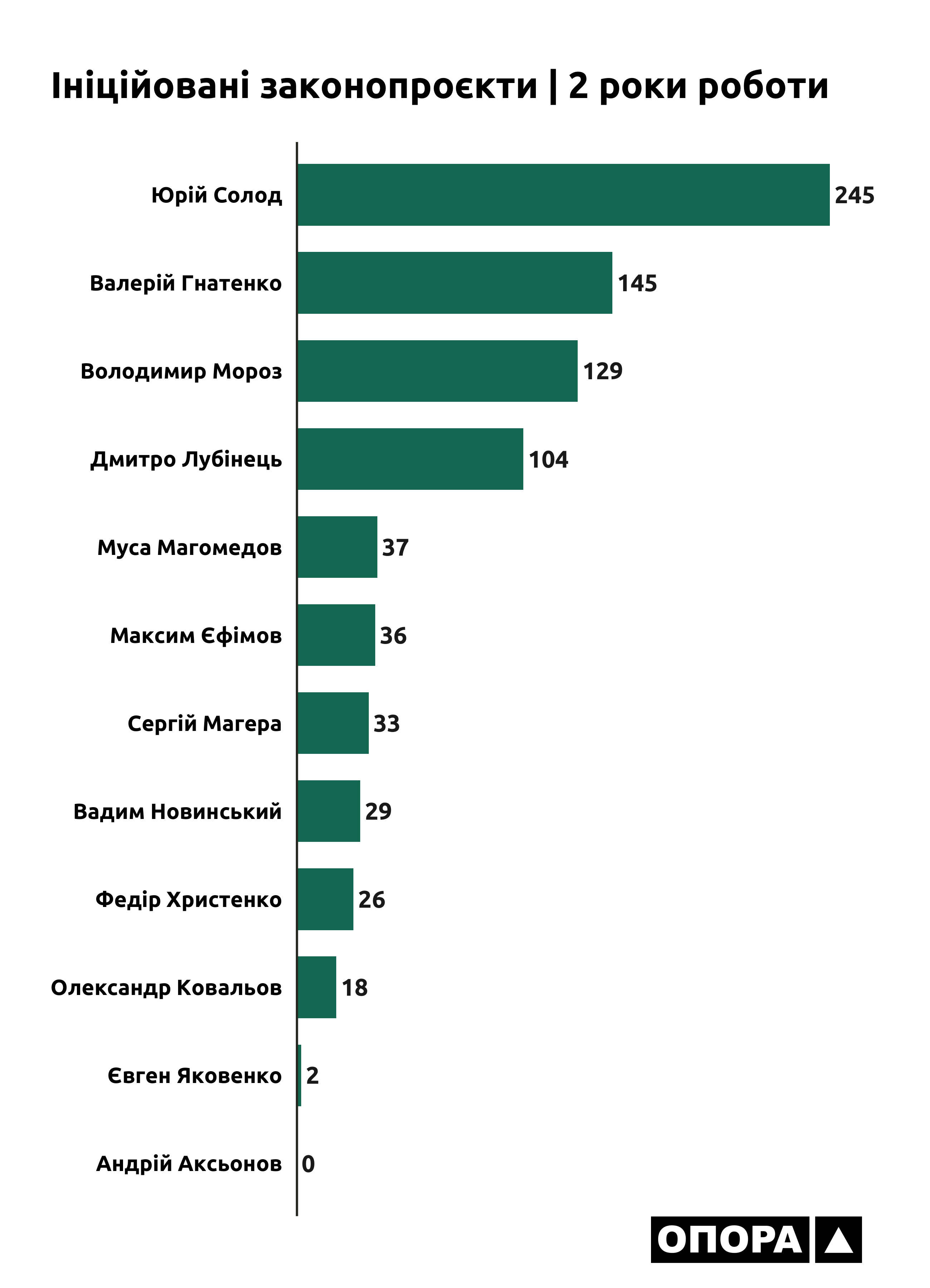 Діяльність роботи депутатів-мажоритарників можна оцінити, зокрема, по якості та кількості законодавчих ініціатив, які вносяться ними на розгляд. Депутати можуть подавати законопроєкти індивідуально або у співавторстві з іншими. Саме другий варіант є більш популярним серед депутатів, бо це збільшує шанс на ухвалення законопроєкту. І першу трійку за кількістю поданих законопроєктів очолюють представники «Опозиційної платформи – За життя»: Юрій Солод з 245 ініційованими законопроєктами, Валерій Гнатенко зі 145 законопроєктами та Володимир Мороз зі 129 ініціативами.
