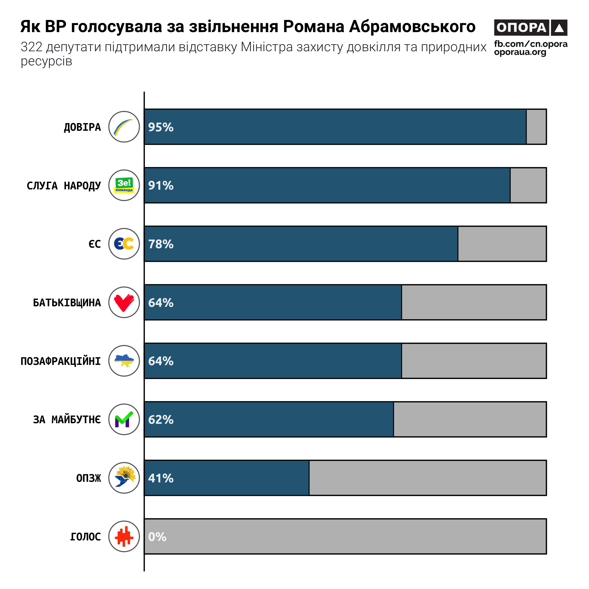 Так, за звільнення Романа Абрамовського проголосували 322 депутати (проти — 1, утрималися — 17, не голосували — 26).  Найбільше голосів за дала депутатська група «Довіра», а саме 95% або 19 депутатів (відсутні — 1). Фракція партії «Слуга народу» голосувала за у 91% або 221 депутат (не голосували — 8, відсутні — 13). «Європейська Солідарність» висловила підтримку на рівні 78% або 21 голос за (не голосували — 2, відсутні — 4). ВО «Батьківщина» підтримала рішення на 64% або 16 голосів депутатів (утрималися — 1, не голосували — 2, відсутні — 6). Позафракційні депутати — 64% або 14 голосів (утрималися — 1, не голосували — 2, відсутні — 5). Депутатська група «За майбутнє» підтримала рішення на 62% або 13 голосів (не голосували — 1, відсутні — 7). «Опозиційна платформа — За життя» дала 41% або 44 голоси (утримались — 1, не голосували — 9, відсутні — 16). Депутати партії «Голос» не дали жодного голосу за (проти — 1, утрималися — 14, не голосували — 2, відсутні — 3).