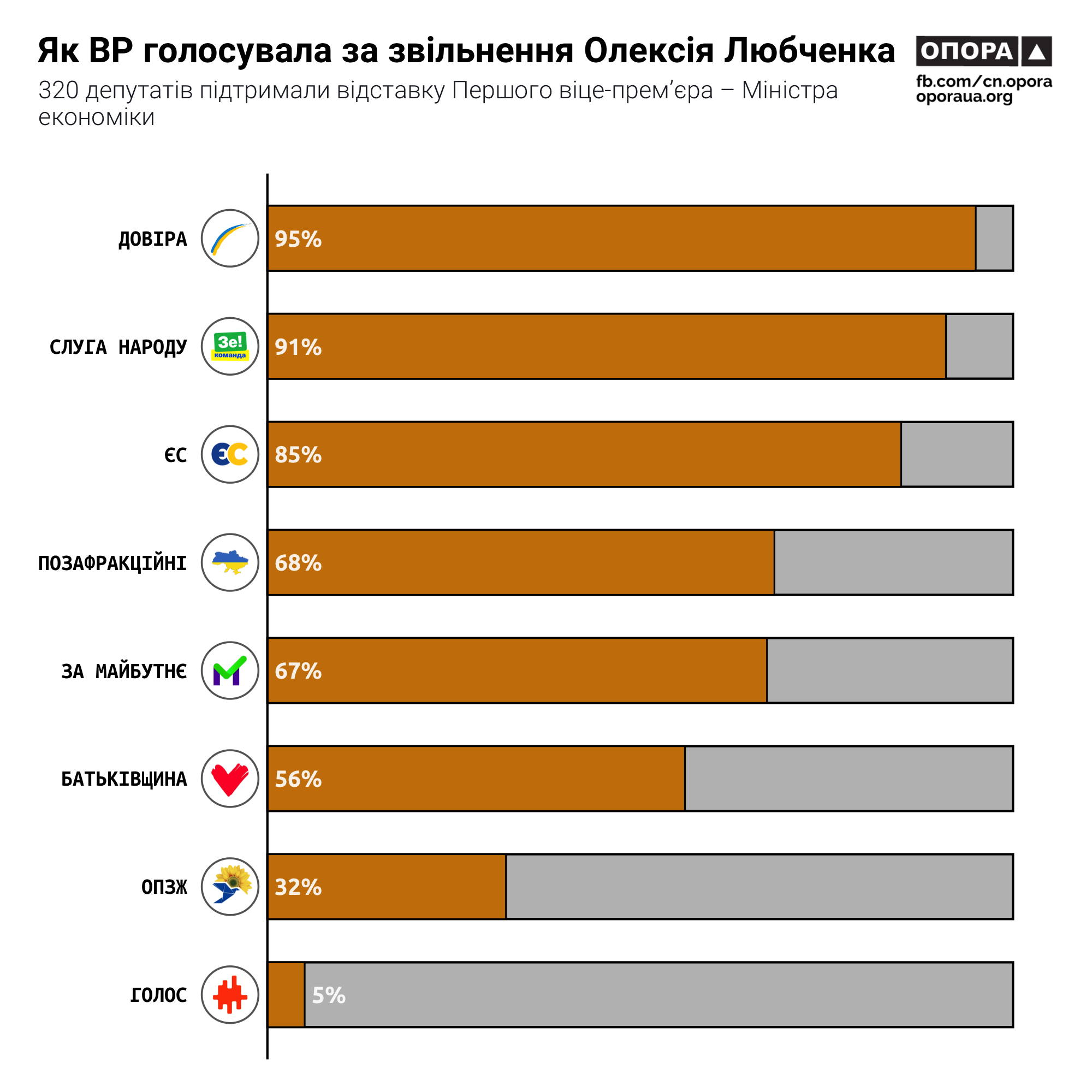 За звільнення з посади Олексія Любченка проголосували 320 депутатів (проти — 1, утрималися — 20, не голосували — 21). Найбільше голосів за це рішення було від депутатської групи «Довіра» 95% або 19 депутатів (відсутні — 1). Фракція партії «Слуга народу» дала 91% або 220 голосів (проти — 1, утрималися — 3, не голосували — 4, відсутні — 14). Солідарна у цьому питанні «Європейська Солідарність» була на 85% або 23 депутати (не голосували — 1, відсутні — 3). Позафракційні погодились на 68% або 15 депутатів (не голосували — 1, відсутні — 6). Депутатська група «За майбутнє» підтримала рішення на 67% або 14 голосів (утрималися — 1, відсутні — 6). ВО «Батьківщина» дала 56% голосів або 14 депутатів (утрималися — 2, не голосували — 1, відсутні — 8). «Опозиційна платформа — За життя» проголосувала на рівні 32% або 14 голосів (утрималися — 2, не голосували — 10, відсутні — 18). «Голос» — 5% або 1 голос (утрималися — 12, не голосували — 4, відсутні — 3).