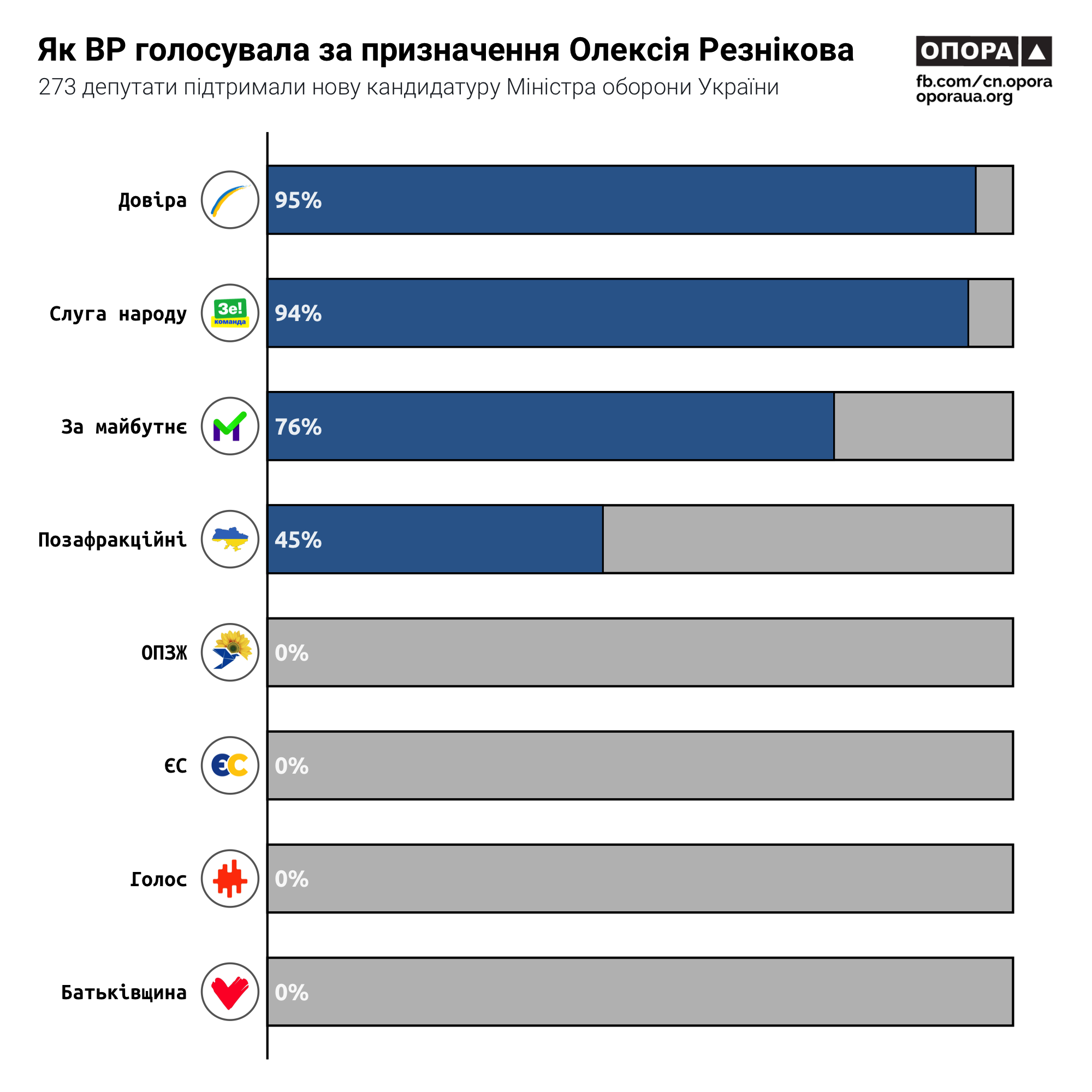 Новим Міністром оборони призначено Олексія Резнікова. Його підтримали 273 нардепа, утримались — 74, не голосували — 27. У “Слузі народу” за нього проголосували 228 депутатів (утримались — 2, відсутні — 12). Депутатська група “Довіра” віддала 19 голосів (не голосував 1 депутат), група “За майбутнє” — 16 (не голосували — 2, відсутні — 3). 10 позафракційних депутатів віддали свої голоси за кандидатуру Резнікова. А фракції “Європейська солідарність”, “Опозиційна платформа — За життя”, “Батьківщина” та “Голос” не дали жодного голосу.