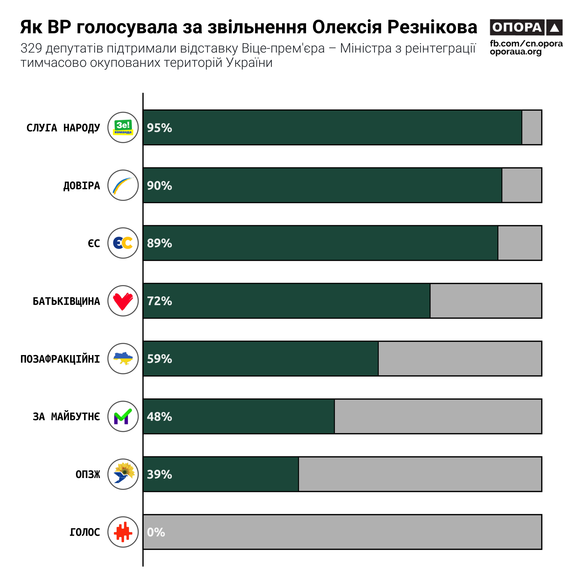 Наступним питанням розглядали відставку Олексія Резнікова, яку підтримала найбільша кількість депутатів, а саме 329 (утрималися — 16, не голосували — 24). Найбільше за це рішення дала фракція партії «Слуга народу» — 95% голосів або 229 депутатів (не голосували — 2, відсутні — 11). Депутатська група «Довіра» дала 90% голосів за або 18 депутатів (не голосували — 1, відсутні — 1). Також високий відсоток підтримки у фракції партії «Європейська Солідарність» — 89% або 24 голоси (не голосували — 1, відсутні — 2). ВО «Батьківщина» підтримала рішення на рівні 72% або 18 депутатів (не голосували — 1, відсутні — 6). Позафракційні депутати проголосували за у 59% випадків або 13 осіб (не голосували — 1, відсутні — 8) Депутатська група «За майбутнє» має показник підтримки у 48% або 10 голосів (не голосували — 5, відсутні — 6). Фракція партії «Опозиційна платформа — За життя» дала 39% або 17 голосів депутатів (утрималися — 2, не голосували — 10, відсутні — 15). Не підтримали це рішення лише депутати фракції «Голос» (утрималися — 14, не голосували — 3, відсутні — 3).