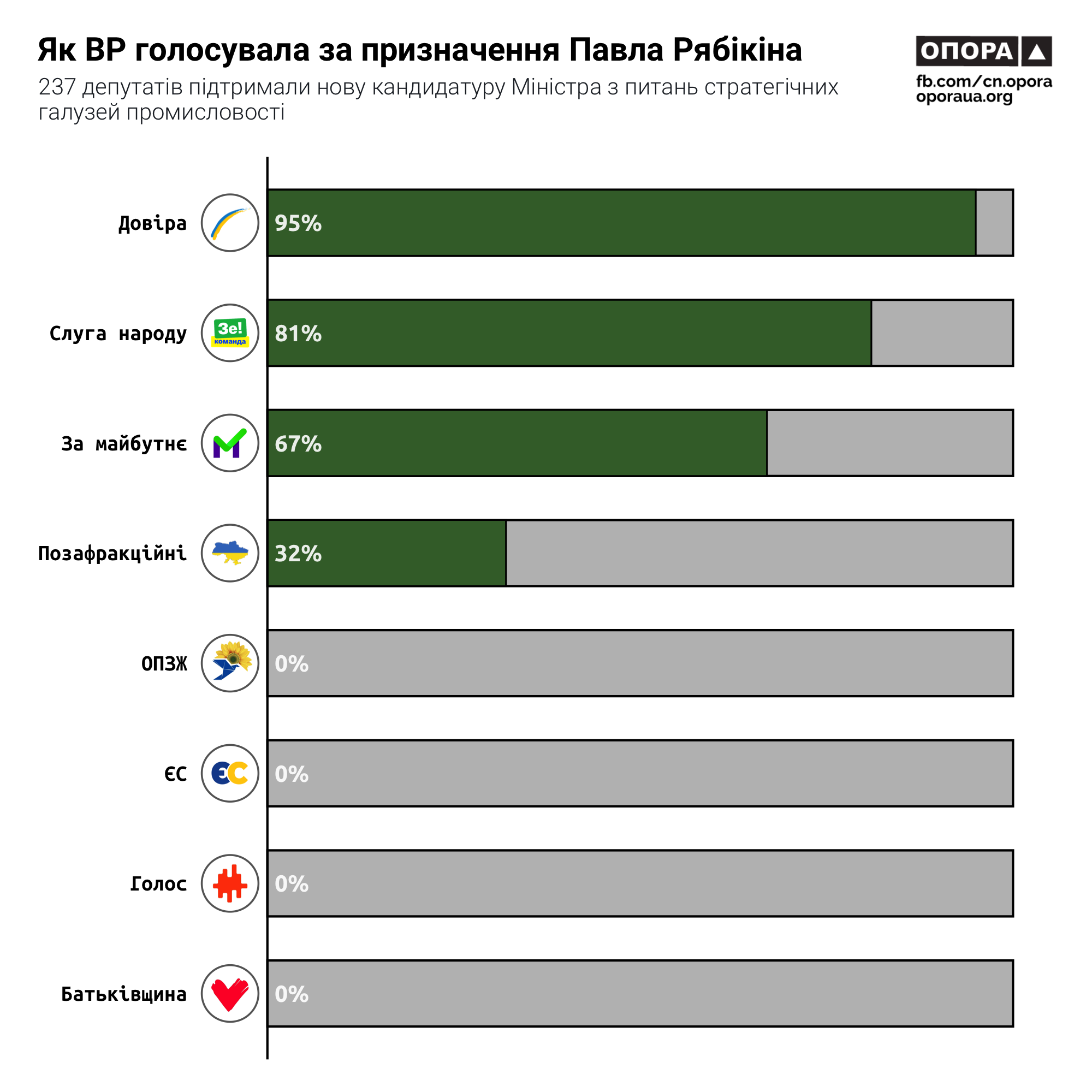 Верховна Рада підтримала пропозицію про призначення Павла Рябікіна Міністром з питань стратегічних галузей промисловості України. За проголосували 237 із 360 присутніх на засіданні, проти було двоє, утрималися — 86, взагалі не голосували — 35. Не підтримали це призначення, як і всі інші, “Європейська Солідарність”, ВО “Батьківщина”, Голос та ОПЗЖ. Водночас депутати від цих політичних сил не голосували проти, вони або були відсутні, або не голосували, або утрималися. Найбільше голосів за це рішення дали представники депутатської групи «Довіра» 95% або 19 депутатів. У фракції партії «Слуга народу» це рішення підтримали 81% або 197 депутатів (проти — 1, утрималися — 13, не голосували — 14, відсутні -17). Депутатська група «За майбутнє» дали підтримку на 67% або 19 голосів (не голосували — 1). Позафракційні депутати погодились із призначенням на 32% або 7 депутатів (проти — 1, утримались — 3, не голосували — 4, відсутні — 7).