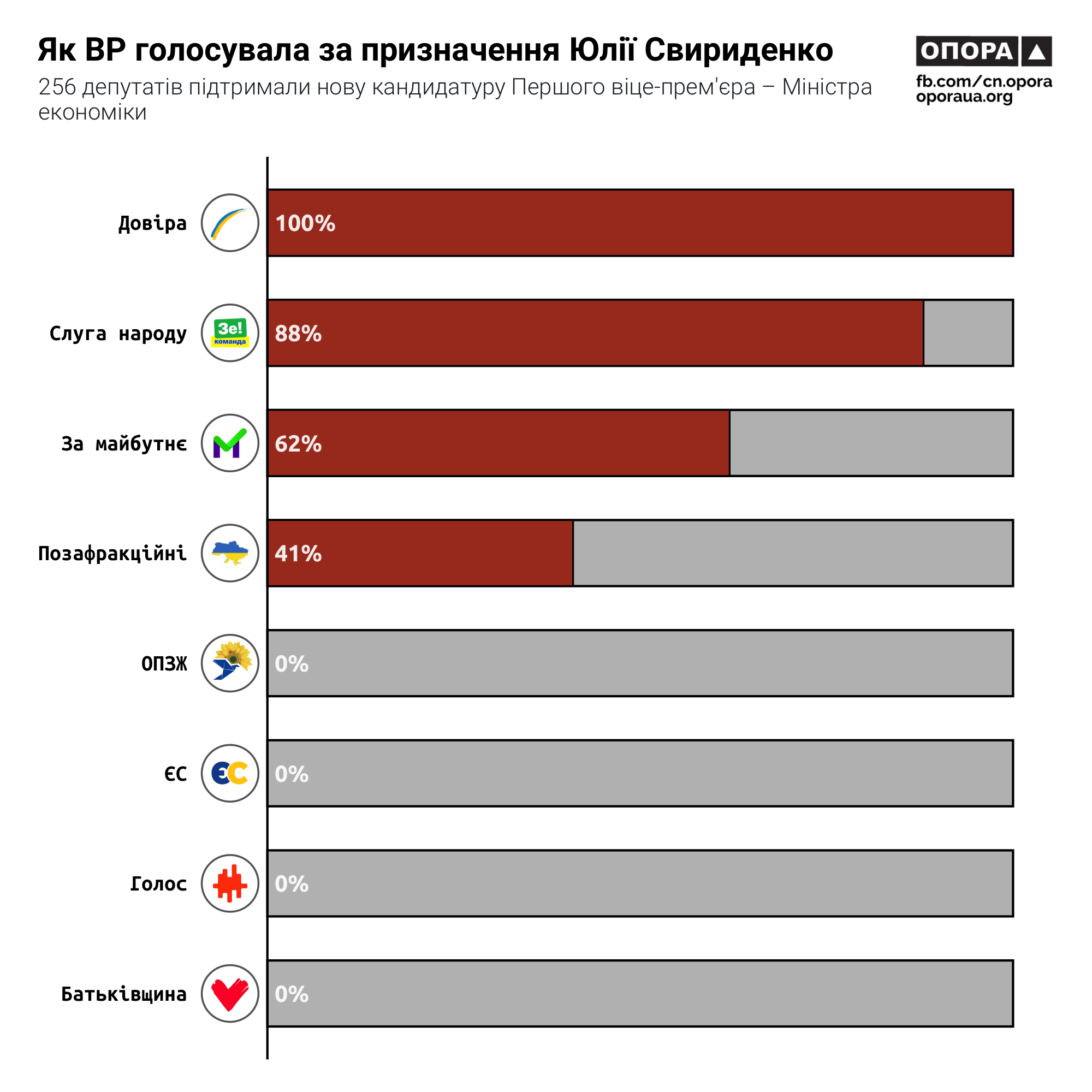 Новою Міністеркою економіки, а також Першою віце-прем'єр-міністеркою Рада призначила Юлію Свириденко. За призначення проголосували 256 депутатів (проти — 11, утрималися — 64, не голосували — 29). Найбільше голосів за це рішення було від депутатської групи «Довіра» 100% або 20 депутатів. Фракція партії «Слуга народу» дала 88% або 214 депутатів (проти — 1, утрималися — 2, не голосували — 9). Не підтримали призначення «Європейська Солідарність» (утрималися — 15, не голосували — 3, відсутні — 6), ВО «Батьківщина» (проти — 9, утрималися — 6, не голосували — 2, відсутні — 8), «Опозиційна платформа — За життя» (утрималися — 19, не голосували — 10, відсутні — 15), «Голос» (утрималися — 16, не голосували — 0, відсутні — 4). Позафракційні депутати погодились із призначенням на 41% або 9 депутатів (проти — 1, утримались — 3, не голосували — 3, відсутні — 6). Депутатська група «За майбутнє» підтримала рішення на 62% або 13 голосів (не голосували — 1, відсутні — 6).
