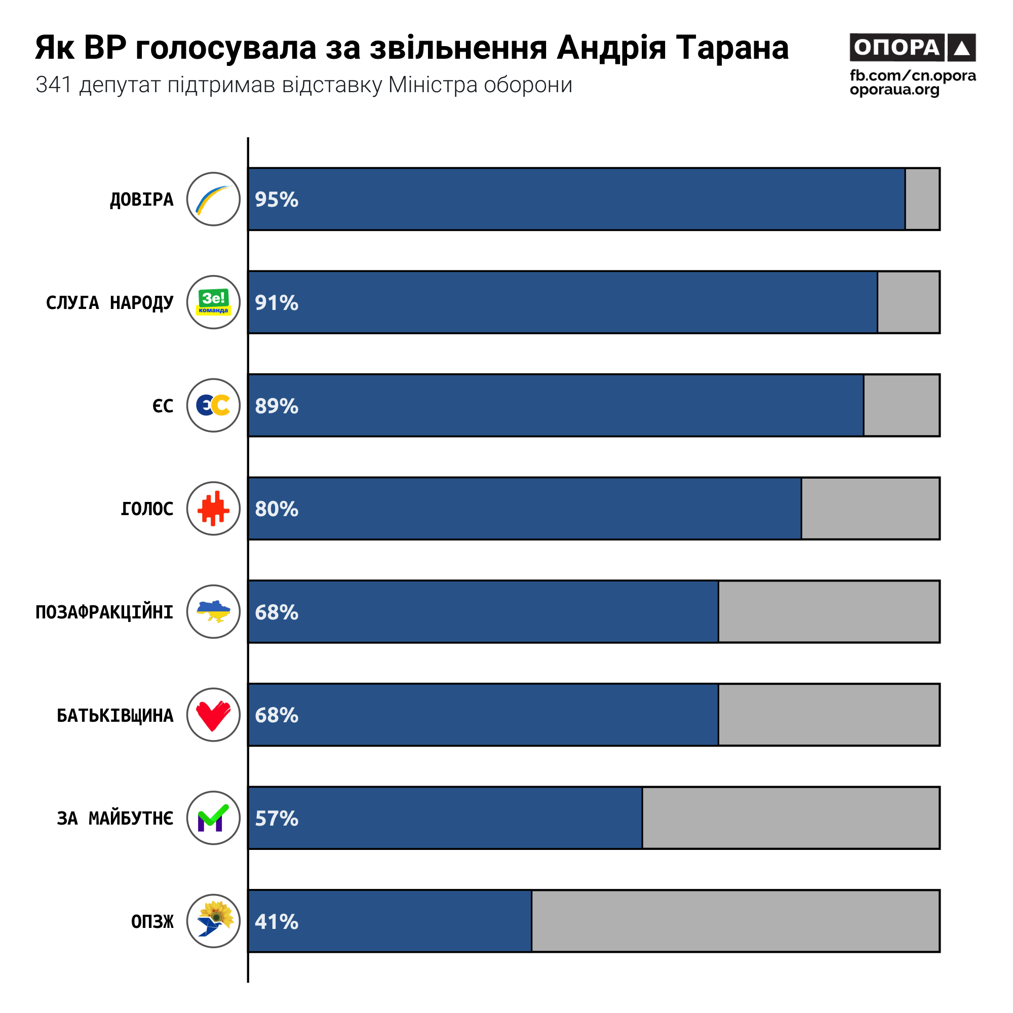 Андрія Тарана у відставку відправили голосуванням за від 341 депутата (утрималися — 2, не голосували — 20). Найбільше голосів підтримки цьому рішенню дала депутатська група  «Довіра» 95% або 19 депутатів (відсутні — 1). «Слуга народу» дала 91% підтримки цього рішення або 220 голосів за (утрималися — 1, не голосували — 7, відсутні — 14). «Європейська Солідарність» підтримала на рівні 89% або 24 голоси (не голосували — 1, відсутні — 2). Також велику підтримку це рішення здобуло у фракції «Голос» 80% або 16 депутатів проголосували за (не голосували — 1, відсутні — 13). Позафракційні депутати дали 68% підтримки або 15 голосів (не голосували — 1, відсутні — 6). ВО «Батьківщина» проголосувала за у 68% випадків або 17 депутатів (не голосували — 1, відсутні — 7). Депутатська група «За майбутнє» висловилась за у 57% або 12 депутатів (не голосували — 1, відсутні — 8). «Опозиційна платформа — За життя» підтримала рішення на 41% або 18 голосів депутатів  (утрималися — 1, не голосували — 8, відсутні — 17).