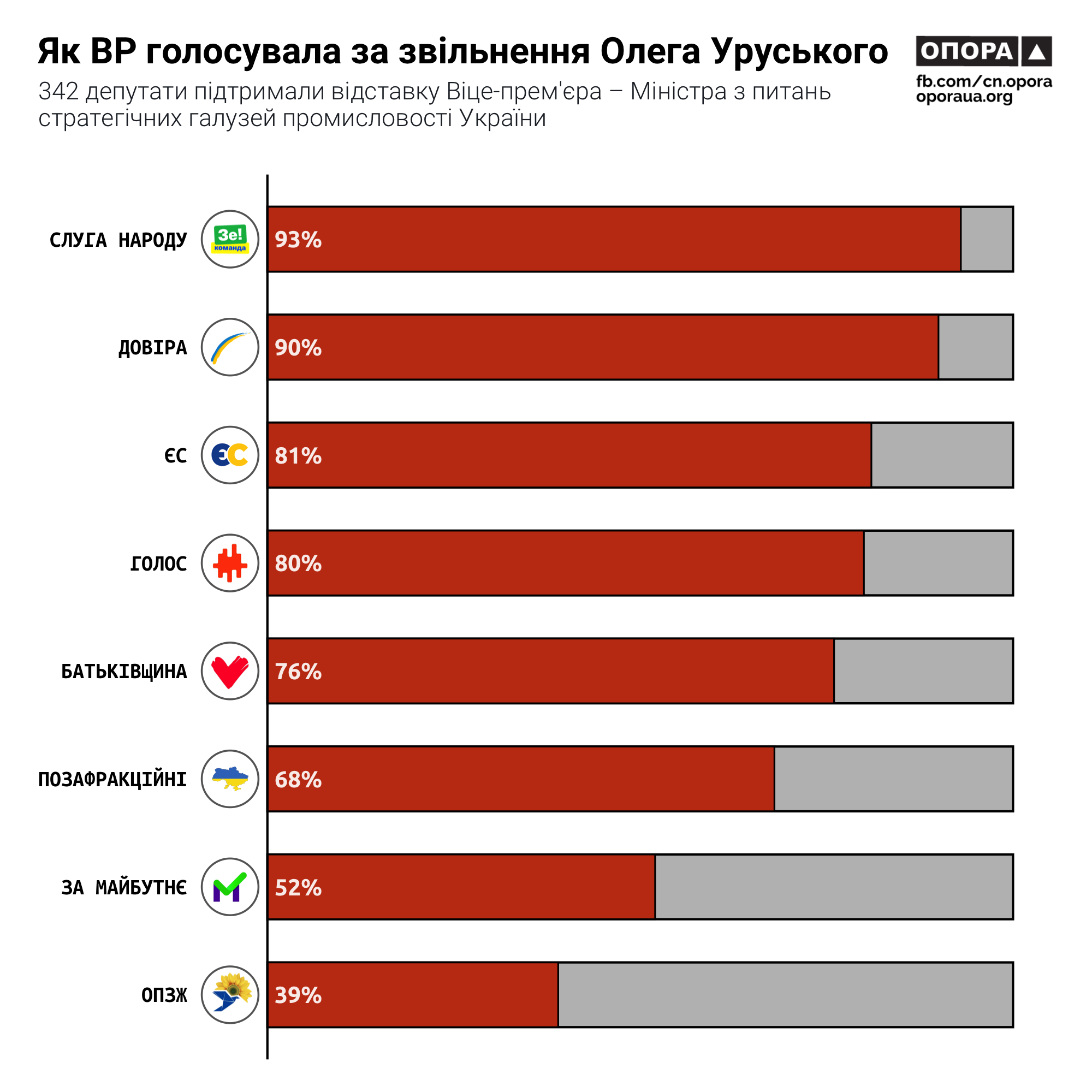 За усунення з посади Олега Уруського проголосували 342 депутати (утримались — 8, не голосували — 18). Найбільше голосів за це рішення дали депутати фракції «Слуга народу», а саме 93% або 224 голосів (утримались — 1, не голосували — 4, відсутні — 13). Депутатська група «Довіра» підтримала на 90% або 18 депутатів (утрималися — 1, відсутні — 1). «Європейська Солідарність» проголосувала на рівні 81% або 22 депутати (утрималися — 1, не голосували — 1, відсутні — 3). Цього разу депутати фракції «Голос» підтримали аж на 80% або 16 голосами (утрималися — 1, не голосували — 1, відсутні — 2). ВО «Батьківщина» дали 76% або 19 голосів (відсутні — 6). Позафракційні депутати проголосували за на рівні 68% або 15 депутатів (утрималися — 1, відсутні — 6). Депутатська фракція «За майбутнє» — 52% або 11 депутатів (не голосували — 3, відсутні — 7). Найменше це рішення підтримала «Опозиційна платформа — За життя» на рівні 39% або 17 депутатів (утрималися — 3, не голосували — 9, відсутні — 15).