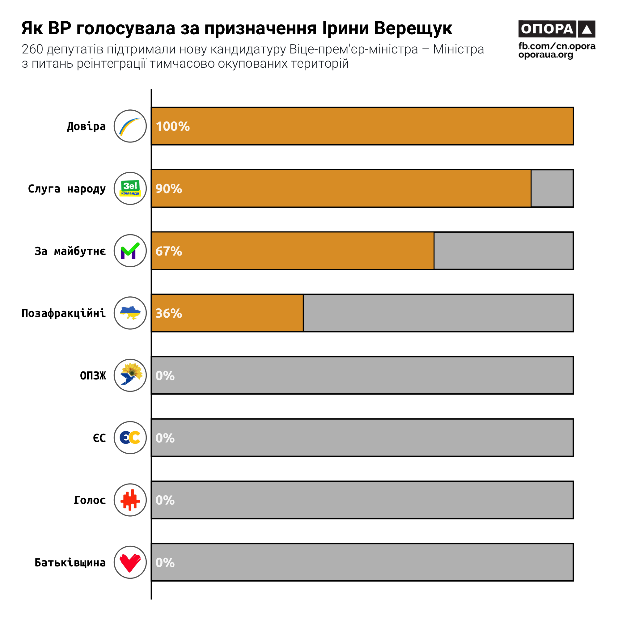 Рада призначила нардепку Ірину Верещук Віце-прем'єр-міністеркою України – Міністеркою з питань реінтеграції тимчасово окупованих територій України. Її кандидатуру підтримали 260 народних депутатів, проти — 1, утримались — 73, не голосували — 23. “Слуга народу” дала найбільше голосів — 218 (утримались — 2, не голосували — 4, відсутні — 18). Депутатська група “Довіра” дала 20 голосів або 100%, група “За майбутнє” — 14 (не голосували — 1, відсутні — 6). 8 голосів дали позафракційні депутати. Фракції “Опозиційна платформа — За життя”, “Європейська солідарність”, “Голос” та “Батьківщина” не дали жодного голосу.