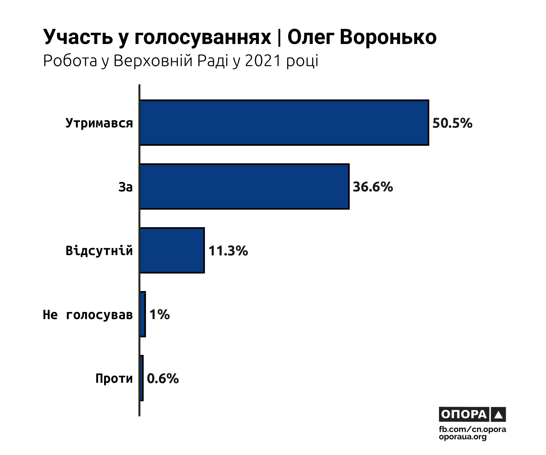 Народний депутат Олег Воронько (округ №103) під час 2896 (50,5%) голосувань утримався, а 2081 раз (36,6%) натискав кнопку «За». Під час 645 голосувань (11,3%) він був відсутній, 58 разів (1%) не голосував і 34 рази був проти.