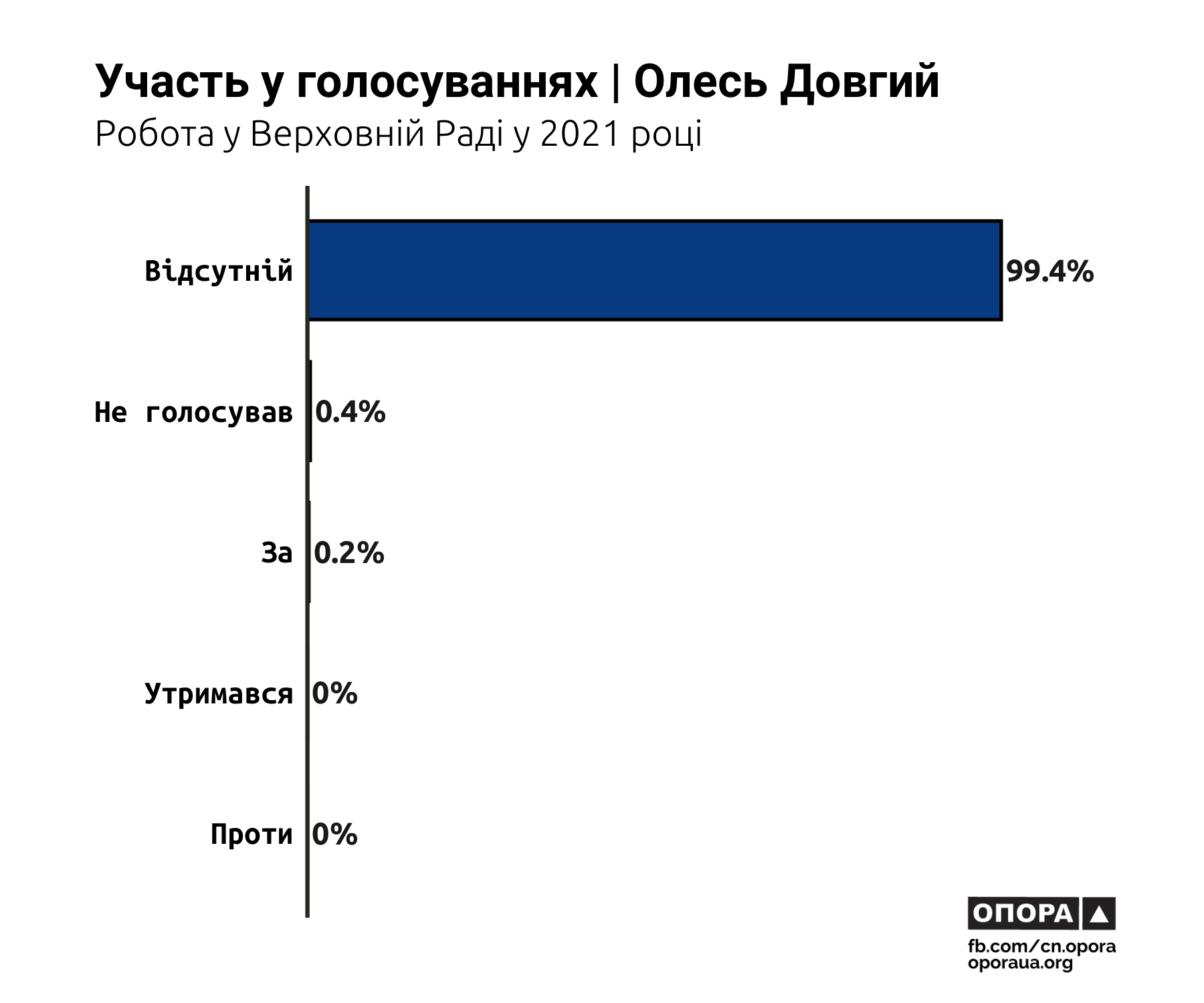 Протягом 2021 року у парламенті відбулося 5687 голосувань. Народні депутати, які представляють Кіровоградську область, під час 28,6% голосувань натискали на кнопку «За», під час 1,1% голосувань — «Проти», під час 37,8% голосувань — «Утримався», ще у 3,1% випадків не голосували, а під час 29,4% голосувань були відсутні. За результатами всеукраїнського дослідження ОПОРИ, до топ-трійки прогульників потрапив народний обранець із Кіровоградщини Олесь Довгий.