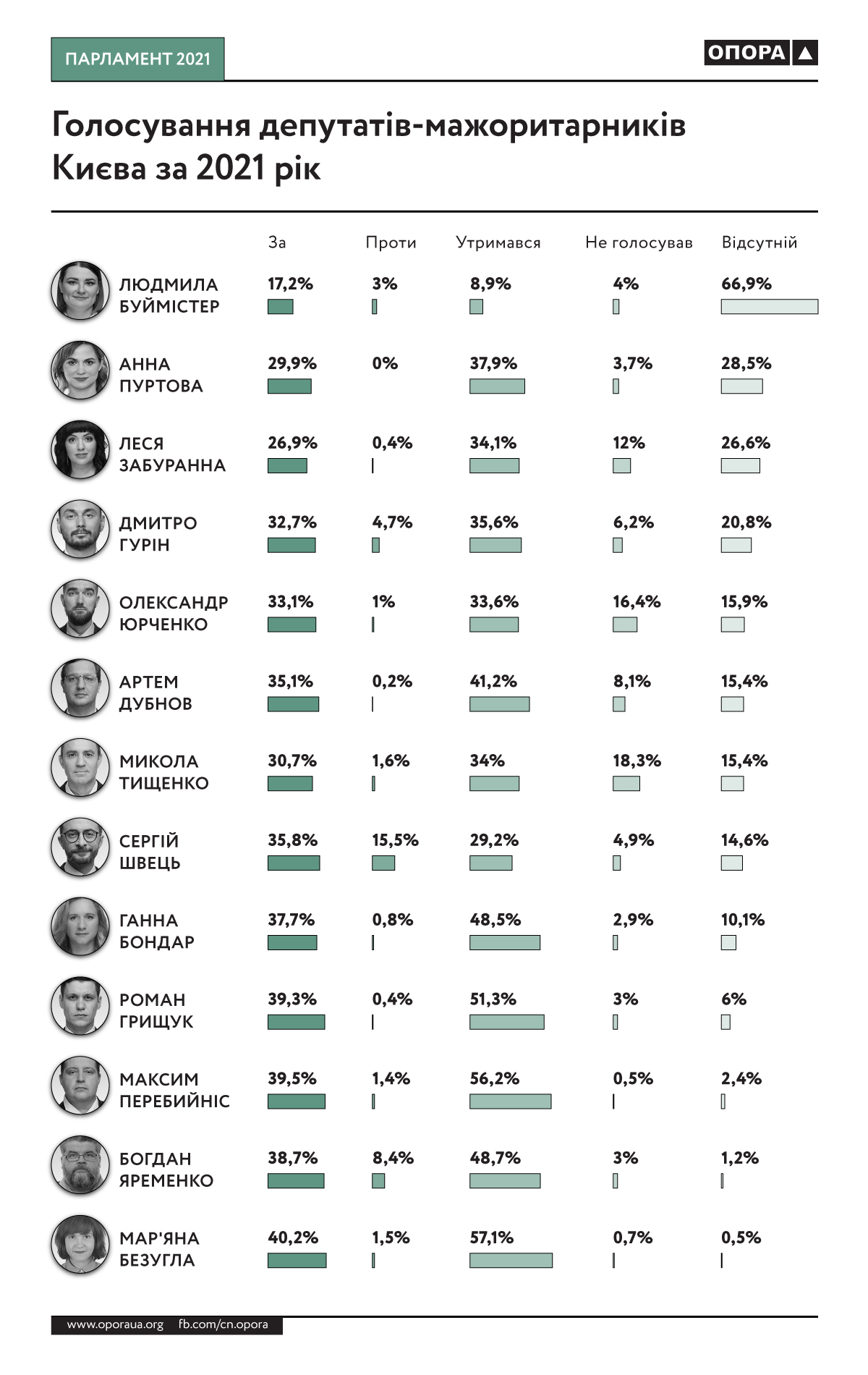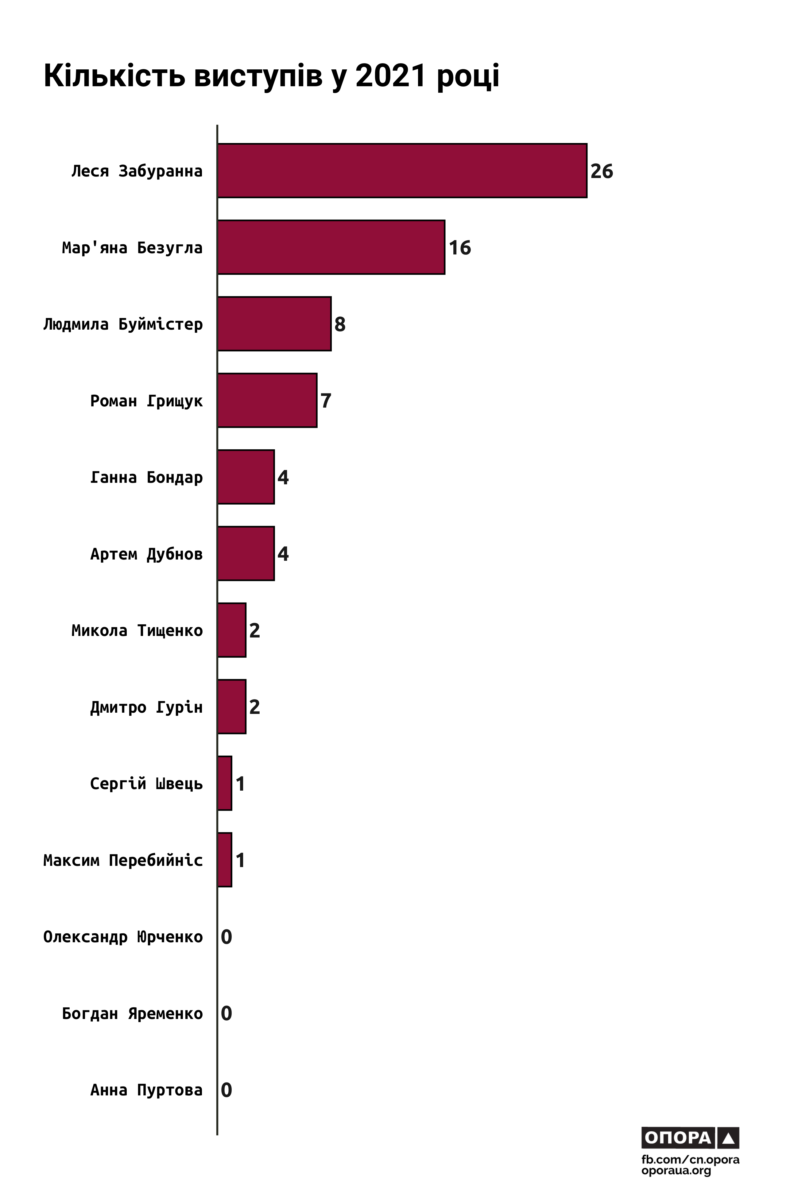 Протягом 2021 року мажоритарники Києва 135 разів отримували слово в парламенті. Жодного разу не виступали з трибуни Анна Пуртова, Олександр Юрченко та Богдан Яременко. При цьому Анна Пуртова взагалі не брала слова протягом всієї каденції.